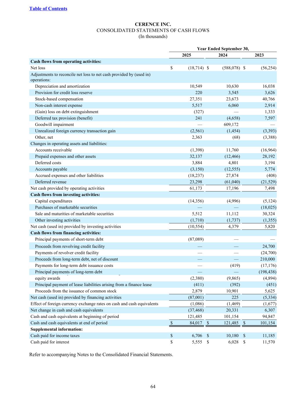 CERENCE INC. CONSOLIDATED STATEMENTS OF CASH FLOWS (In thousands) Year Ended September 30, 2025 2024 2023 Cash flows from operating activities: Net loss $ (18,714) $ (588,078) $ (56,254) Adjustments to reconcile net loss to net cash provided by (used in) operations: Depreciation and amortization 10,549 10,630 16,038 Provision for credit loss reserve 220 3,545 3,626 Stock-based compensation 27,351 23,673 40,766 Non-cash interest expense 5,517 6,060 2,914 (Gain) loss on debt extinguishment (327) — 1,333 Deferred tax provision (benefit) 241 (4,658) 7,597 Goodwill impairment — 609,172 — Unrealized foreign currency transaction gain (2,561) (1,454) (3,393) Other, net 2,363 (68) (3,388) Changes in operating assets and liabilities: Accounts receivable (1,398) 11,760 (16,964) Prepaid expenses and other assets 32,137 (12,466) 28,192 Deferred costs 3,884 4,801 3,194 Accounts payable (3,150) (12,555) 5,774 Accrued expenses and other liabilities (18,237) 27,874 (408) Deferred revenue 23,298 (61,040) (21,529) Net cash provided by operating activities 61,173 17,196 7,498 Cash flows from investing activities: Capital expenditures (14,356) (4,996) (5,124) Purchases of marketable securities — — (18,025) Sale and maturities of marketable securities 5,512 11,112 30,324 Other investing activities (1,710) (1,737) (1,355) Net cash (used in) provided by investing activities (10,554) 4,379 5,820 Cash flows from financing activities: Principal payments of short-term debt (87,089) — — Proceeds from revolving credit facility — — 24,700 Payments of revolver credit facility — — (24,700) Proceeds from long-term debt, net of discount — — 210,000 Payments for long-term debt issuance costs — (419) (17,176) Principal payments of long-term debt — — (198,438) Common stock repurchases for tax withholdings for net settlement of equity awards (2,380) (9,865) (4,894) Principal payment of lease liabilities arising from a finance lease (411) (392) (451) Proceeds from the issuance of common stock 2,879 10,901 5,625 Net cash (used in) provided by financing activities (87,001) 225 (5,334) Effect of foreign currency exchange rates on cash and cash equivalents (1,086) (1,469) (1,677) Net change in cash and cash equivalents (37,468) 20,331 6,307 Cash and cash equivalents at beginning of period 121,485 101,154 94,847 Cash and cash equivalents at end of period $ 84,017 $ 121,485 $ 101,154 Supplemental information: Cash paid for income taxes $ 6,706 $ 10,180 $ 11,185 Cash paid for interest $ 5,555 $ 6,028 $ 11,570 Refer to accompanying Notes to the Consolidated Financial Statements. Table of Contents 64
