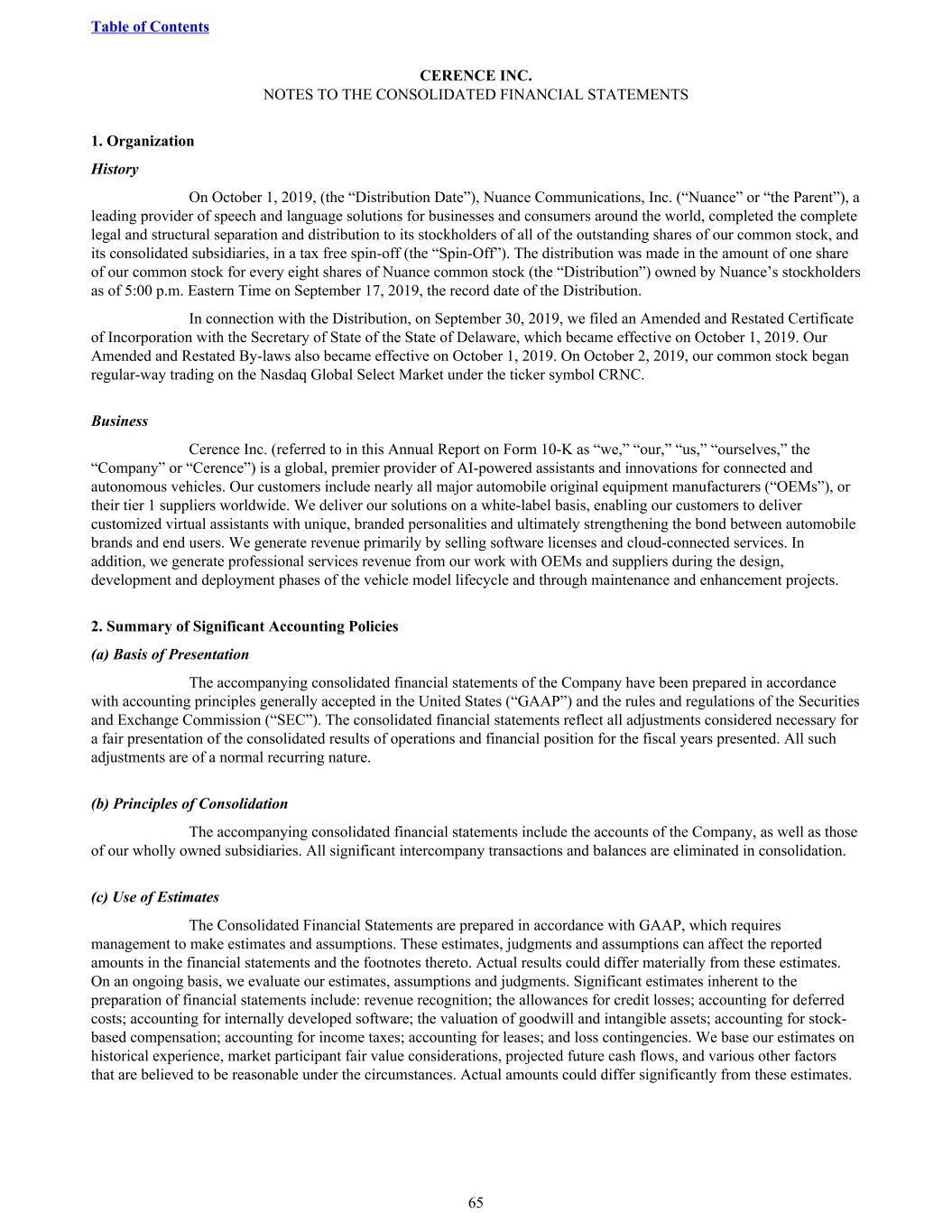 CERENCE INC. NOTES TO THE CONSOLIDATED FINANCIAL STATEMENTS 1. Organization History On October 1, 2019, (the “Distribution Date”), Nuance Communications, Inc. (“Nuance” or “the Parent”), a leading provider of speech and language solutions for businesses and consumers around the world, completed the complete legal and structural separation and distribution to its stockholders of all of the outstanding shares of our common stock, and its consolidated subsidiaries, in a tax free spin-off (the “Spin-Off”). The distribution was made in the amount of one share of our common stock for every eight shares of Nuance common stock (the “Distribution”) owned by Nuance’s stockholders as of 5:00 p.m. Eastern Time on September 17, 2019, the record date of the Distribution. In connection with the Distribution, on September 30, 2019, we filed an Amended and Restated Certificate of Incorporation with the Secretary of State of the State of Delaware, which became effective on October 1, 2019. Our Amended and Restated By-laws also became effective on October 1, 2019. On October 2, 2019, our common stock began regular-way trading on the Nasdaq Global Select Market under the ticker symbol CRNC. Business Cerence Inc. (referred to in this Annual Report on Form 10-K as “we,” “our,” “us,” “ourselves,” the “Company” or “Cerence”) is a global, premier provider of AI-powered assistants and innovations for connected and autonomous vehicles. Our customers include nearly all major automobile original equipment manufacturers (“OEMs”), or their tier 1 suppliers worldwide. We deliver our solutions on a white-label basis, enabling our customers to deliver customized virtual assistants with unique, branded personalities and ultimately strengthening the bond between automobile brands and end users. We generate revenue primarily by selling software licenses and cloud-connected services. In addition, we generate professional services revenue from our work with OEMs and suppliers during the design, development and deployment phases of the vehicle model lifecycle and through maintenance and enhancement projects. 2. Summary of Significant Accounting Policies (a) Basis of Presentation The accompanying consolidated financial statements of the Company have been prepared in accordance with accounting principles generally accepted in the United States (“GAAP”) and the rules and regulations of the Securities and Exchange Commission (“SEC”). The consolidated financial statements reflect all adjustments considered necessary for a fair presentation of the consolidated results of operations and financial position for the fiscal years presented. All such adjustments are of a normal recurring nature. (b) Principles of Consolidation The accompanying consolidated financial statements include the accounts of the Company, as well as those of our wholly owned subsidiaries. All significant intercompany transactions and balances are eliminated in consolidation. (c) Use of Estimates The Consolidated Financial Statements are prepared in accordance with GAAP, which requires management to make estimates and assumptions. These estimates, judgments and assumptions can affect the reported amounts in the financial statements and the footnotes thereto. Actual results could differ materially from these estimates. On an ongoing basis, we evaluate our estimates, assumptions and judgments. Significant estimates inherent to the preparation of financial statements include: revenue recognition; the allowances for credit losses; accounting for deferred costs; accounting for internally developed software; the valuation of goodwill and intangible assets; accounting for stock- based compensation; accounting for income taxes; accounting for leases; and loss contingencies. We base our estimates on historical experience, market participant fair value considerations, projected future cash flows, and various other factors that are believed to be reasonable under the circumstances. Actual amounts could differ significantly from these estimates. Table of Contents 65