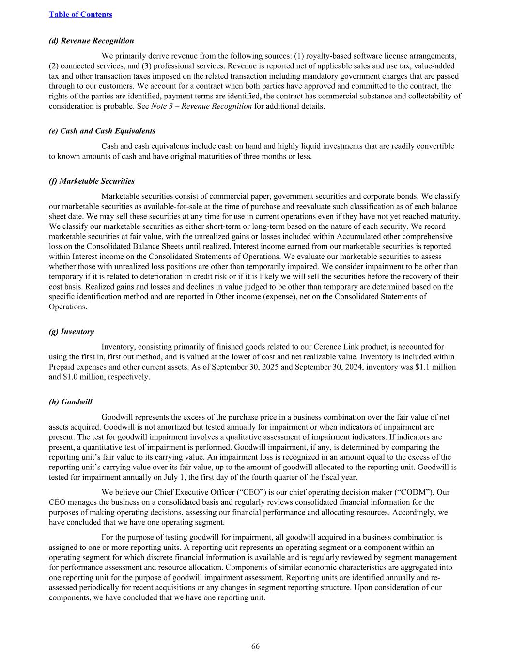 (d) Revenue Recognition We primarily derive revenue from the following sources: (1) royalty-based software license arrangements, (2) connected services, and (3) professional services. Revenue is reported net of applicable sales and use tax, value-added tax and other transaction taxes imposed on the related transaction including mandatory government charges that are passed through to our customers. We account for a contract when both parties have approved and committed to the contract, the rights of the parties are identified, payment terms are identified, the contract has commercial substance and collectability of consideration is probable. See Note 3 – Revenue Recognition for additional details. (e) Cash and Cash Equivalents Cash and cash equivalents include cash on hand and highly liquid investments that are readily convertible to known amounts of cash and have original maturities of three months or less. (f) Marketable Securities Marketable securities consist of commercial paper, government securities and corporate bonds. We classify our marketable securities as available-for-sale at the time of purchase and reevaluate such classification as of each balance sheet date. We may sell these securities at any time for use in current operations even if they have not yet reached maturity. We classify our marketable securities as either short-term or long-term based on the nature of each security. We record marketable securities at fair value, with the unrealized gains or losses included within Accumulated other comprehensive loss on the Consolidated Balance Sheets until realized. Interest income earned from our marketable securities is reported within Interest income on the Consolidated Statements of Operations. We evaluate our marketable securities to assess whether those with unrealized loss positions are other than temporarily impaired. We consider impairment to be other than temporary if it is related to deterioration in credit risk or if it is likely we will sell the securities before the recovery of their cost basis. Realized gains and losses and declines in value judged to be other than temporary are determined based on the specific identification method and are reported in Other income (expense), net on the Consolidated Statements of Operations. (g) Inventory Inventory, consisting primarily of finished goods related to our Cerence Link product, is accounted for using the first in, first out method, and is valued at the lower of cost and net realizable value. Inventory is included within Prepaid expenses and other current assets. As of September 30, 2025 and September 30, 2024, inventory was $1.1 million and $1.0 million, respectively. (h) Goodwill Goodwill represents the excess of the purchase price in a business combination over the fair value of net assets acquired. Goodwill is not amortized but tested annually for impairment or when indicators of impairment are present. The test for goodwill impairment involves a qualitative assessment of impairment indicators. If indicators are present, a quantitative test of impairment is performed. Goodwill impairment, if any, is determined by comparing the reporting unit’s fair value to its carrying value. An impairment loss is recognized in an amount equal to the excess of the reporting unit’s carrying value over its fair value, up to the amount of goodwill allocated to the reporting unit. Goodwill is tested for impairment annually on July 1, the first day of the fourth quarter of the fiscal year. We believe our Chief Executive Officer (“CEO”) is our chief operating decision maker (“CODM”). Our CEO manages the business on a consolidated basis and regularly reviews consolidated financial information for the purposes of making operating decisions, assessing our financial performance and allocating resources. Accordingly, we have concluded that we have one operating segment. For the purpose of testing goodwill for impairment, all goodwill acquired in a business combination is assigned to one or more reporting units. A reporting unit represents an operating segment or a component within an operating segment for which discrete financial information is available and is regularly reviewed by segment management for performance assessment and resource allocation. Components of similar economic characteristics are aggregated into one reporting unit for the purpose of goodwill impairment assessment. Reporting units are identified annually and re- assessed periodically for recent acquisitions or any changes in segment reporting structure. Upon consideration of our components, we have concluded that we have one reporting unit. Table of Contents 66