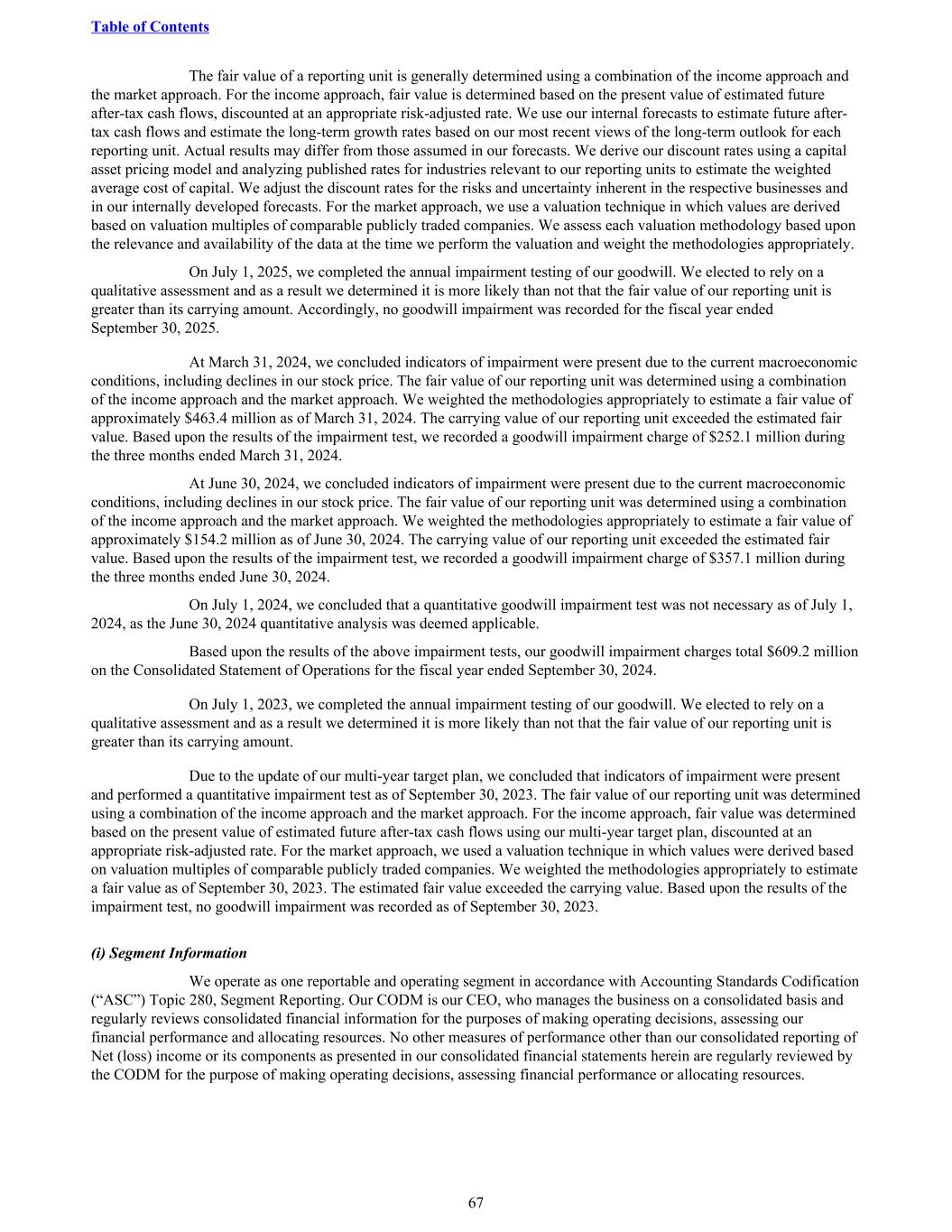 The fair value of a reporting unit is generally determined using a combination of the income approach and the market approach. For the income approach, fair value is determined based on the present value of estimated future after-tax cash flows, discounted at an appropriate risk-adjusted rate. We use our internal forecasts to estimate future after- tax cash flows and estimate the long-term growth rates based on our most recent views of the long-term outlook for each reporting unit. Actual results may differ from those assumed in our forecasts. We derive our discount rates using a capital asset pricing model and analyzing published rates for industries relevant to our reporting units to estimate the weighted average cost of capital. We adjust the discount rates for the risks and uncertainty inherent in the respective businesses and in our internally developed forecasts. For the market approach, we use a valuation technique in which values are derived based on valuation multiples of comparable publicly traded companies. We assess each valuation methodology based upon the relevance and availability of the data at the time we perform the valuation and weight the methodologies appropriately. On July 1, 2025, we completed the annual impairment testing of our goodwill. We elected to rely on a qualitative assessment and as a result we determined it is more likely than not that the fair value of our reporting unit is greater than its carrying amount. Accordingly, no goodwill impairment was recorded for the fiscal year ended September 30, 2025. At March 31, 2024, we concluded indicators of impairment were present due to the current macroeconomic conditions, including declines in our stock price. The fair value of our reporting unit was determined using a combination of the income approach and the market approach. We weighted the methodologies appropriately to estimate a fair value of approximately $463.4 million as of March 31, 2024. The carrying value of our reporting unit exceeded the estimated fair value. Based upon the results of the impairment test, we recorded a goodwill impairment charge of $252.1 million during the three months ended March 31, 2024. At June 30, 2024, we concluded indicators of impairment were present due to the current macroeconomic conditions, including declines in our stock price. The fair value of our reporting unit was determined using a combination of the income approach and the market approach. We weighted the methodologies appropriately to estimate a fair value of approximately $154.2 million as of June 30, 2024. The carrying value of our reporting unit exceeded the estimated fair value. Based upon the results of the impairment test, we recorded a goodwill impairment charge of $357.1 million during the three months ended June 30, 2024. On July 1, 2024, we concluded that a quantitative goodwill impairment test was not necessary as of July 1, 2024, as the June 30, 2024 quantitative analysis was deemed applicable. Based upon the results of the above impairment tests, our goodwill impairment charges total $609.2 million on the Consolidated Statement of Operations for the fiscal year ended September 30, 2024. On July 1, 2023, we completed the annual impairment testing of our goodwill. We elected to rely on a qualitative assessment and as a result we determined it is more likely than not that the fair value of our reporting unit is greater than its carrying amount. Due to the update of our multi-year target plan, we concluded that indicators of impairment were present and performed a quantitative impairment test as of September 30, 2023. The fair value of our reporting unit was determined using a combination of the income approach and the market approach. For the income approach, fair value was determined based on the present value of estimated future after-tax cash flows using our multi-year target plan, discounted at an appropriate risk-adjusted rate. For the market approach, we used a valuation technique in which values were derived based on valuation multiples of comparable publicly traded companies. We weighted the methodologies appropriately to estimate a fair value as of September 30, 2023. The estimated fair value exceeded the carrying value. Based upon the results of the impairment test, no goodwill impairment was recorded as of September 30, 2023. (i) Segment Information We operate as one reportable and operating segment in accordance with Accounting Standards Codification (“ASC”) Topic 280, Segment Reporting. Our CODM is our CEO, who manages the business on a consolidated basis and regularly reviews consolidated financial information for the purposes of making operating decisions, assessing our financial performance and allocating resources. No other measures of performance other than our consolidated reporting of Net (loss) income or its components as presented in our consolidated financial statements herein are regularly reviewed by the CODM for the purpose of making operating decisions, assessing financial performance or allocating resources. Table of Contents 67