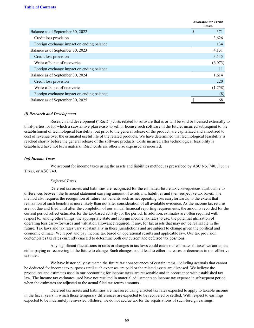 Allowance for Credit Losses Balance as of September 30, 2022 $ 371 Credit loss provision 3,626 Foreign exchange impact on ending balance 134 Balance as of September 30, 2023 4,131 Credit loss provision 3,545 Write-offs, net of recoveries (6,073) Foreign exchange impact on ending balance 11 Balance as of September 30, 2024 1,614 Credit loss provision 220 Write-offs, net of recoveries (1,758) Foreign exchange impact on ending balance (8) Balance as of September 30, 2025 $ 68 (l) Research and Development Research and development (“R&D”) costs related to software that is or will be sold or licensed externally to third-parties, or for which a substantive plan exists to sell or license such software in the future, incurred subsequent to the establishment of technological feasibility, but prior to the general release of the product, are capitalized and amortized to cost of revenue over the estimated useful life of the related products. We have determined that technological feasibility is reached shortly before the general release of the software products. Costs incurred after technological feasibility is established have not been material. R&D costs are otherwise expensed as incurred. (m) Income Taxes We account for income taxes using the assets and liabilities method, as prescribed by ASC No. 740, Income Taxes, or ASC 740. Deferred Taxes Deferred tax assets and liabilities are recognized for the estimated future tax consequences attributable to differences between the financial statement carrying amount of assets and liabilities and their respective tax bases. The method also requires the recognition of future tax benefits such as net operating loss carryforwards, to the extent that realization of such benefits is more likely than not after consideration of all available evidence. As the income tax returns are not due and filed until after the completion of our annual financial reporting requirements, the amounts recorded for the current period reflect estimates for the tax-based activity for the period. In addition, estimates are often required with respect to, among other things, the appropriate state and foreign income tax rates to use, the potential utilization of operating loss carry-forwards and valuation allowance required, if any, for tax assets that may not be realizable in the future. Tax laws and tax rates vary substantially in these jurisdictions and are subject to change given the political and economic climate. We report and pay income tax based on operational results and applicable law. Our tax provision contemplates tax rates currently enacted to determine both our current and deferred tax positions. Any significant fluctuations in rates or changes in tax laws could cause our estimates of taxes we anticipate either paying or recovering in the future to change. Such changes could lead to either increases or decreases in our effective tax rates. We have historically estimated the future tax consequences of certain items, including accruals that cannot be deducted for income tax purposes until such expenses are paid or the related assets are disposed. We believe the procedures and estimates used in our accounting for income taxes are reasonable and in accordance with established tax law. The income tax estimates used have not resulted in material adjustments to income tax expense in subsequent period when the estimates are adjusted to the actual filed tax return amounts. Deferred tax assets and liabilities are measured using enacted tax rates expected to apply to taxable income in the fiscal years in which those temporary differences are expected to be recovered or settled. With respect to earnings expected to be indefinitely reinvested offshore, we do not accrue tax for the repatriations of such foreign earnings. Table of Contents 69