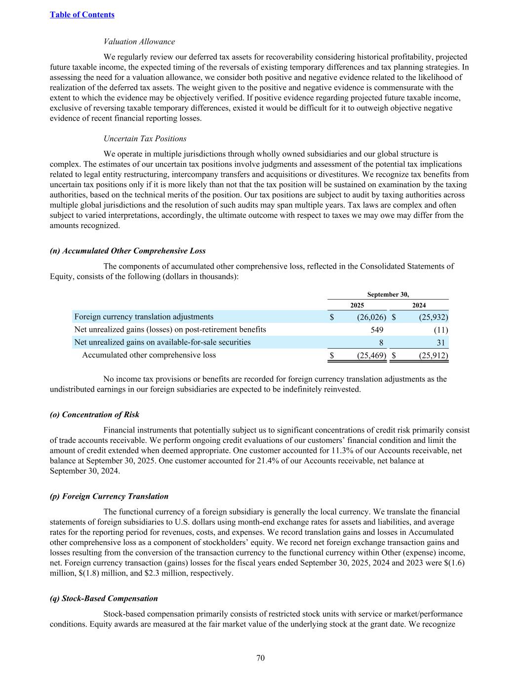 Valuation Allowance We regularly review our deferred tax assets for recoverability considering historical profitability, projected future taxable income, the expected timing of the reversals of existing temporary differences and tax planning strategies. In assessing the need for a valuation allowance, we consider both positive and negative evidence related to the likelihood of realization of the deferred tax assets. The weight given to the positive and negative evidence is commensurate with the extent to which the evidence may be objectively verified. If positive evidence regarding projected future taxable income, exclusive of reversing taxable temporary differences, existed it would be difficult for it to outweigh objective negative evidence of recent financial reporting losses. Uncertain Tax Positions We operate in multiple jurisdictions through wholly owned subsidiaries and our global structure is complex. The estimates of our uncertain tax positions involve judgments and assessment of the potential tax implications related to legal entity restructuring, intercompany transfers and acquisitions or divestitures. We recognize tax benefits from uncertain tax positions only if it is more likely than not that the tax position will be sustained on examination by the taxing authorities, based on the technical merits of the position. Our tax positions are subject to audit by taxing authorities across multiple global jurisdictions and the resolution of such audits may span multiple years. Tax laws are complex and often subject to varied interpretations, accordingly, the ultimate outcome with respect to taxes we may owe may differ from the amounts recognized. (n) Accumulated Other Comprehensive Loss The components of accumulated other comprehensive loss, reflected in the Consolidated Statements of Equity, consists of the following (dollars in thousands): September 30, 2025 2024 Foreign currency translation adjustments $ (26,026) $ (25,932) Net unrealized gains (losses) on post-retirement benefits 549 (11) Net unrealized gains on available-for-sale securities 8 31 Accumulated other comprehensive loss $ (25,469) $ (25,912) No income tax provisions or benefits are recorded for foreign currency translation adjustments as the undistributed earnings in our foreign subsidiaries are expected to be indefinitely reinvested. (o) Concentration of Risk Financial instruments that potentially subject us to significant concentrations of credit risk primarily consist of trade accounts receivable. We perform ongoing credit evaluations of our customers’ financial condition and limit the amount of credit extended when deemed appropriate. One customer accounted for 11.3% of our Accounts receivable, net balance at September 30, 2025. One customer accounted for 21.4% of our Accounts receivable, net balance at September 30, 2024. (p) Foreign Currency Translation The functional currency of a foreign subsidiary is generally the local currency. We translate the financial statements of foreign subsidiaries to U.S. dollars using month-end exchange rates for assets and liabilities, and average rates for the reporting period for revenues, costs, and expenses. We record translation gains and losses in Accumulated other comprehensive loss as a component of stockholders’ equity. We record net foreign exchange transaction gains and losses resulting from the conversion of the transaction currency to the functional currency within Other (expense) income, net. Foreign currency transaction (gains) losses for the fiscal years ended September 30, 2025, 2024 and 2023 were $(1.6) million, $(1.8) million, and $2.3 million, respectively. (q) Stock-Based Compensation Stock-based compensation primarily consists of restricted stock units with service or market/performance conditions. Equity awards are measured at the fair market value of the underlying stock at the grant date. We recognize Table of Contents 70