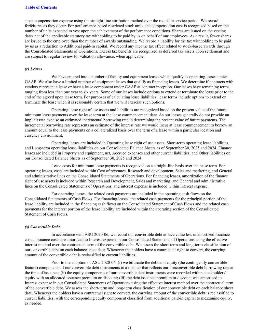 stock compensation expense using the straight-line attribution method over the requisite service period. We record forfeitures as they occur. For performance-based restricted stock units, the compensation cost is recognized based on the number of units expected to vest upon the achievement of the performance conditions. Shares are issued on the vesting dates net of the applicable statutory tax withholding to be paid by us on behalf of our employees. As a result, fewer shares are issued to the employee than the number of awards outstanding. We record a liability for the tax withholding to be paid by us as a reduction to Additional paid-in capital. We record any income tax effect related to stock-based awards through the Consolidated Statements of Operations. Excess tax benefits are recognized as deferred tax assets upon settlement and are subject to regular review for valuation allowance, when applicable. (r) Leases We have entered into a number of facility and equipment leases which qualify as operating leases under GAAP. We also have a limited number of equipment leases that qualify as financing leases. We determine if contracts with vendors represent a lease or have a lease component under GAAP at contract inception. Our leases have remaining terms ranging from less than one year to six years. Some of our leases include options to extend or terminate the lease prior to the end of the agreed upon lease term. For purposes of calculating lease liabilities, lease terms include options to extend or terminate the lease when it is reasonably certain that we will exercise such options. Operating lease right of use assets and liabilities are recognized based on the present value of the future minimum lease payments over the lease term at the lease commencement date. As our leases generally do not provide an implicit rate, we use an estimated incremental borrowing rate in determining the present value of future payments. The incremental borrowing rate represents an estimate of the interest rate we would incur at lease commencement to borrow an amount equal to the lease payments on a collateralized basis over the term of a lease within a particular location and currency environment. Operating leases are included in Operating lease right of use assets, Short-term operating lease liabilities, and Long-term operating lease liabilities on our Consolidated Balance Sheets as of September 30, 2025 and 2024. Finance leases are included in Property and equipment, net, Accrued expenses and other current liabilities, and Other liabilities on our Consolidated Balance Sheets as of September 30, 2025 and 2024. Lease costs for minimum lease payments is recognized on a straight-line basis over the lease term. For operating leases, costs are included within Cost of revenues, Research and development, Sales and marketing, and General and administrative lines on the Consolidated Statements of Operations. For financing leases, amortization of the finance right of use assets is included within Research and Development, Sales and marketing, and General and administrative lines on the Consolidated Statements of Operations, and interest expense is included within Interest expense. For operating leases, the related cash payments are included in the operating cash flows on the Consolidated Statements of Cash Flows. For financing leases, the related cash payments for the principal portion of the lease liability are included in the financing cash flows on the Consolidated Statement of Cash Flows and the related cash payments for the interest portion of the lease liability are included within the operating section of the Consolidated Statement of Cash Flows. (s) Convertible Debt In accordance with ASU 2020-06, we record our convertible debt at face value less unamortized issuance costs. Issuance costs are amortized to Interest expense in our Consolidated Statements of Operations using the effective interest method over the contractual term of the convertible debt. We assess the short-term and long-term classification of our convertible debt on each balance sheet date. Whenever the holders have a contractual right to convert, the carrying amount of the convertible debt is reclassified to current liabilities. Prior to the adoption of ASU 2020-06: (i) we bifurcate the debt and equity (the contingently convertible feature) components of our convertible debt instruments in a manner that reflects our nonconvertible debt borrowing rate at the time of issuance; (ii) the equity components of our convertible debt instruments were recorded within stockholders’ equity with an allocated issuance premium or discount; (iii) the debt issuance premium or discount was amortized to Interest expense in our Consolidated Statements of Operations using the effective interest method over the contractual term of the convertible debt. We assess the short-term and long-term classification of our convertible debt on each balance sheet date. Whenever the holders have a contractual right to convert, the carrying amount of the convertible debt is reclassified to current liabilities, with the corresponding equity component classified from additional paid-in capital to mezzanine equity, as needed. Table of Contents 71