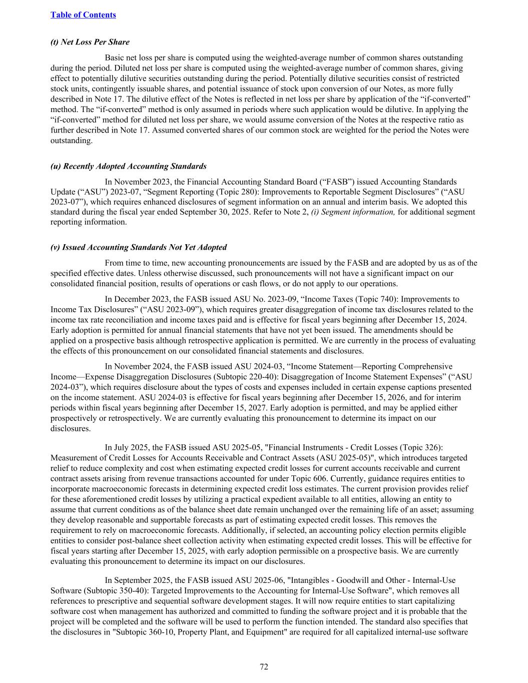 (t) Net Loss Per Share Basic net loss per share is computed using the weighted-average number of common shares outstanding during the period. Diluted net loss per share is computed using the weighted-average number of common shares, giving effect to potentially dilutive securities outstanding during the period. Potentially dilutive securities consist of restricted stock units, contingently issuable shares, and potential issuance of stock upon conversion of our Notes, as more fully described in Note 17. The dilutive effect of the Notes is reflected in net loss per share by application of the “if-converted” method. The “if-converted” method is only assumed in periods where such application would be dilutive. In applying the “if-converted” method for diluted net loss per share, we would assume conversion of the Notes at the respective ratio as further described in Note 17. Assumed converted shares of our common stock are weighted for the period the Notes were outstanding. (u) Recently Adopted Accounting Standards In November 2023, the Financial Accounting Standard Board (“FASB”) issued Accounting Standards Update (“ASU”) 2023-07, “Segment Reporting (Topic 280): Improvements to Reportable Segment Disclosures” (“ASU 2023-07”), which requires enhanced disclosures of segment information on an annual and interim basis. We adopted this standard during the fiscal year ended September 30, 2025. Refer to Note 2, (i) Segment information, for additional segment reporting information. (v) Issued Accounting Standards Not Yet Adopted From time to time, new accounting pronouncements are issued by the FASB and are adopted by us as of the specified effective dates. Unless otherwise discussed, such pronouncements will not have a significant impact on our consolidated financial position, results of operations or cash flows, or do not apply to our operations. In December 2023, the FASB issued ASU No. 2023-09, “Income Taxes (Topic 740): Improvements to Income Tax Disclosures” (“ASU 2023-09”), which requires greater disaggregation of income tax disclosures related to the income tax rate reconciliation and income taxes paid and is effective for fiscal years beginning after December 15, 2024. Early adoption is permitted for annual financial statements that have not yet been issued. The amendments should be applied on a prospective basis although retrospective application is permitted. We are currently in the process of evaluating the effects of this pronouncement on our consolidated financial statements and disclosures. In November 2024, the FASB issued ASU 2024-03, “Income Statement—Reporting Comprehensive Income—Expense Disaggregation Disclosures (Subtopic 220-40): Disaggregation of Income Statement Expenses” (“ASU 2024-03”), which requires disclosure about the types of costs and expenses included in certain expense captions presented on the income statement. ASU 2024-03 is effective for fiscal years beginning after December 15, 2026, and for interim periods within fiscal years beginning after December 15, 2027. Early adoption is permitted, and may be applied either prospectively or retrospectively. We are currently evaluating this pronouncement to determine its impact on our disclosures. In July 2025, the FASB issued ASU 2025-05, "Financial Instruments - Credit Losses (Topic 326): Measurement of Credit Losses for Accounts Receivable and Contract Assets (ASU 2025-05)", which introduces targeted relief to reduce complexity and cost when estimating expected credit losses for current accounts receivable and current contract assets arising from revenue transactions accounted for under Topic 606. Currently, guidance requires entities to incorporate macroeconomic forecasts in determining expected credit loss estimates. The current provision provides relief for these aforementioned credit losses by utilizing a practical expedient available to all entities, allowing an entity to assume that current conditions as of the balance sheet date remain unchanged over the remaining life of an asset; assuming they develop reasonable and supportable forecasts as part of estimating expected credit losses. This removes the requirement to rely on macroeconomic forecasts. Additionally, if selected, an accounting policy election permits eligible entities to consider post-balance sheet collection activity when estimating expected credit losses. This will be effective for fiscal years starting after December 15, 2025, with early adoption permissible on a prospective basis. We are currently evaluating this pronouncement to determine its impact on our disclosures. In September 2025, the FASB issued ASU 2025-06, "Intangibles - Goodwill and Other - Internal-Use Software (Subtopic 350-40): Targeted Improvements to the Accounting for Internal-Use Software", which removes all references to prescriptive and sequential software development stages. It will now require entities to start capitalizing software cost when management has authorized and committed to funding the software project and it is probable that the project will be completed and the software will be used to perform the function intended. The standard also specifies that the disclosures in "Subtopic 360-10, Property Plant, and Equipment" are required for all capitalized internal-use software Table of Contents 72