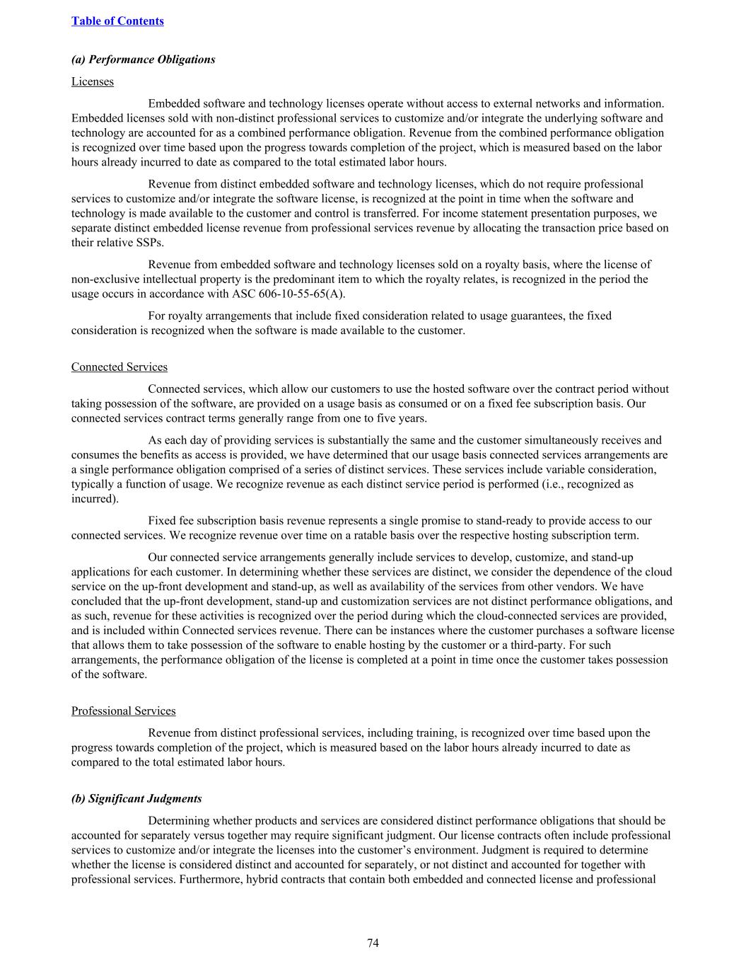 (a) Performance Obligations Licenses Embedded software and technology licenses operate without access to external networks and information. Embedded licenses sold with non-distinct professional services to customize and/or integrate the underlying software and technology are accounted for as a combined performance obligation. Revenue from the combined performance obligation is recognized over time based upon the progress towards completion of the project, which is measured based on the labor hours already incurred to date as compared to the total estimated labor hours. Revenue from distinct embedded software and technology licenses, which do not require professional services to customize and/or integrate the software license, is recognized at the point in time when the software and technology is made available to the customer and control is transferred. For income statement presentation purposes, we separate distinct embedded license revenue from professional services revenue by allocating the transaction price based on their relative SSPs. Revenue from embedded software and technology licenses sold on a royalty basis, where the license of non-exclusive intellectual property is the predominant item to which the royalty relates, is recognized in the period the usage occurs in accordance with ASC 606-10-55-65(A). For royalty arrangements that include fixed consideration related to usage guarantees, the fixed consideration is recognized when the software is made available to the customer. Connected Services Connected services, which allow our customers to use the hosted software over the contract period without taking possession of the software, are provided on a usage basis as consumed or on a fixed fee subscription basis. Our connected services contract terms generally range from one to five years. As each day of providing services is substantially the same and the customer simultaneously receives and consumes the benefits as access is provided, we have determined that our usage basis connected services arrangements are a single performance obligation comprised of a series of distinct services. These services include variable consideration, typically a function of usage. We recognize revenue as each distinct service period is performed (i.e., recognized as incurred). Fixed fee subscription basis revenue represents a single promise to stand-ready to provide access to our connected services. We recognize revenue over time on a ratable basis over the respective hosting subscription term. Our connected service arrangements generally include services to develop, customize, and stand-up applications for each customer. In determining whether these services are distinct, we consider the dependence of the cloud service on the up-front development and stand-up, as well as availability of the services from other vendors. We have concluded that the up-front development, stand-up and customization services are not distinct performance obligations, and as such, revenue for these activities is recognized over the period during which the cloud-connected services are provided, and is included within Connected services revenue. There can be instances where the customer purchases a software license that allows them to take possession of the software to enable hosting by the customer or a third-party. For such arrangements, the performance obligation of the license is completed at a point in time once the customer takes possession of the software. Professional Services Revenue from distinct professional services, including training, is recognized over time based upon the progress towards completion of the project, which is measured based on the labor hours already incurred to date as compared to the total estimated labor hours. (b) Significant Judgments Determining whether products and services are considered distinct performance obligations that should be accounted for separately versus together may require significant judgment. Our license contracts often include professional services to customize and/or integrate the licenses into the customer’s environment. Judgment is required to determine whether the license is considered distinct and accounted for separately, or not distinct and accounted for together with professional services. Furthermore, hybrid contracts that contain both embedded and connected license and professional Table of Contents 74