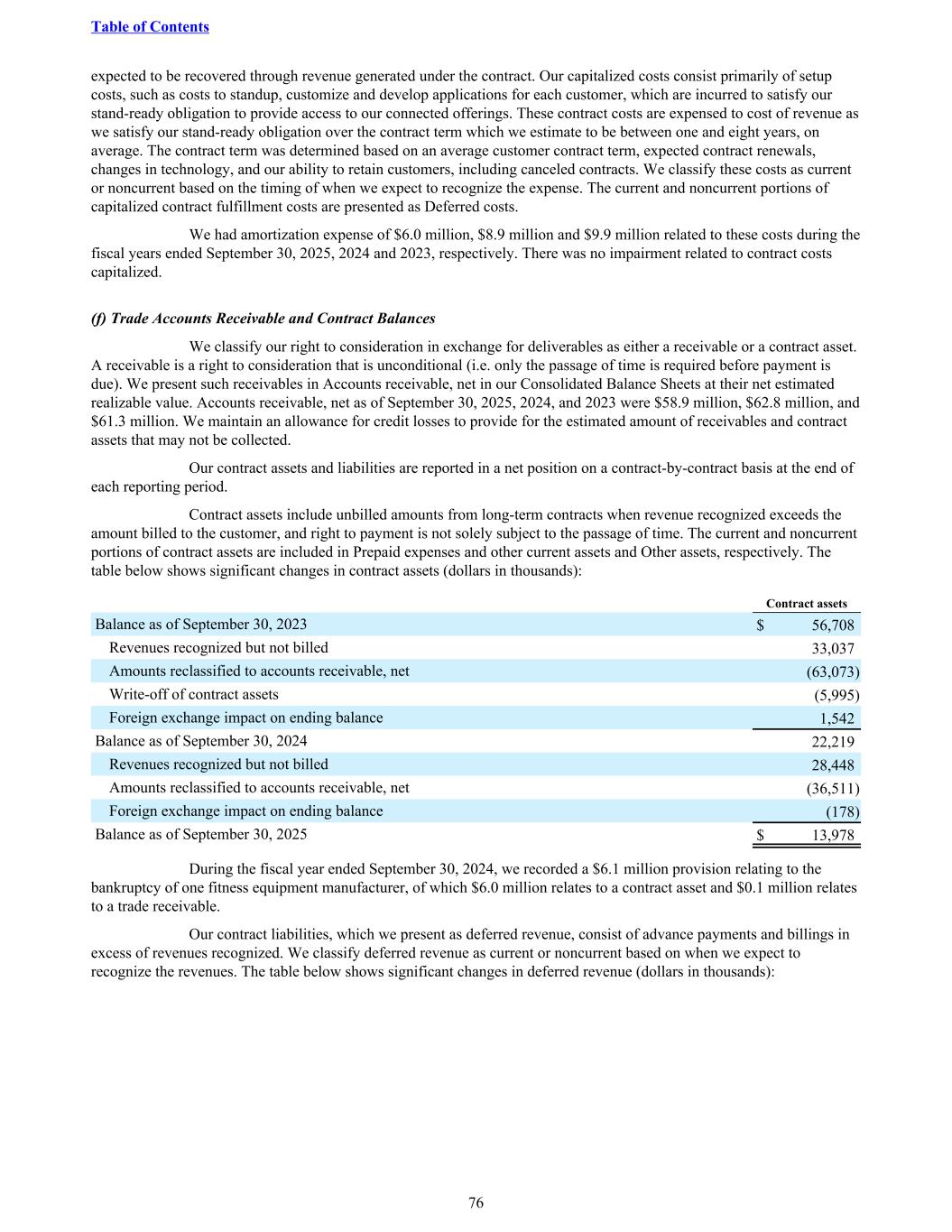expected to be recovered through revenue generated under the contract. Our capitalized costs consist primarily of setup costs, such as costs to standup, customize and develop applications for each customer, which are incurred to satisfy our stand-ready obligation to provide access to our connected offerings. These contract costs are expensed to cost of revenue as we satisfy our stand-ready obligation over the contract term which we estimate to be between one and eight years, on average. The contract term was determined based on an average customer contract term, expected contract renewals, changes in technology, and our ability to retain customers, including canceled contracts. We classify these costs as current or noncurrent based on the timing of when we expect to recognize the expense. The current and noncurrent portions of capitalized contract fulfillment costs are presented as Deferred costs. We had amortization expense of $6.0 million, $8.9 million and $9.9 million related to these costs during the fiscal years ended September 30, 2025, 2024 and 2023, respectively. There was no impairment related to contract costs capitalized. (f) Trade Accounts Receivable and Contract Balances We classify our right to consideration in exchange for deliverables as either a receivable or a contract asset. A receivable is a right to consideration that is unconditional (i.e. only the passage of time is required before payment is due). We present such receivables in Accounts receivable, net in our Consolidated Balance Sheets at their net estimated realizable value. Accounts receivable, net as of September 30, 2025, 2024, and 2023 were $58.9 million, $62.8 million, and $61.3 million. We maintain an allowance for credit losses to provide for the estimated amount of receivables and contract assets that may not be collected. Our contract assets and liabilities are reported in a net position on a contract-by-contract basis at the end of each reporting period. Contract assets include unbilled amounts from long-term contracts when revenue recognized exceeds the amount billed to the customer, and right to payment is not solely subject to the passage of time. The current and noncurrent portions of contract assets are included in Prepaid expenses and other current assets and Other assets, respectively. The table below shows significant changes in contract assets (dollars in thousands): Contract assets Balance as of September 30, 2023 $ 56,708 Revenues recognized but not billed 33,037 Amounts reclassified to accounts receivable, net (63,073) Write-off of contract assets (5,995) Foreign exchange impact on ending balance 1,542 Balance as of September 30, 2024 22,219 Revenues recognized but not billed 28,448 Amounts reclassified to accounts receivable, net (36,511) Foreign exchange impact on ending balance (178) Balance as of September 30, 2025 $ 13,978 During the fiscal year ended September 30, 2024, we recorded a $6.1 million provision relating to the bankruptcy of one fitness equipment manufacturer, of which $6.0 million relates to a contract asset and $0.1 million relates to a trade receivable. Our contract liabilities, which we present as deferred revenue, consist of advance payments and billings in excess of revenues recognized. We classify deferred revenue as current or noncurrent based on when we expect to recognize the revenues. The table below shows significant changes in deferred revenue (dollars in thousands): Table of Contents 76