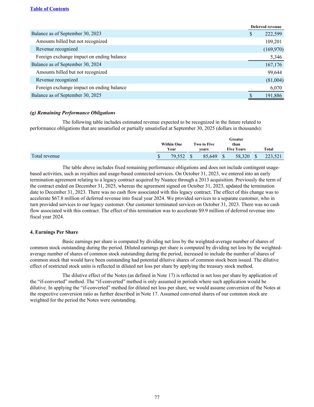 Deferred revenue Balance as of September 30, 2023 $ 222,599 Amounts billed but not recognized 109,201 Revenue recognized (169,970) Foreign exchange impact on ending balance 5,346 Balance as of September 30, 2024 167,176 Amounts billed but not recognized 99,644 Revenue recognized (81,004) Foreign exchange impact on ending balance 6,070 Balance as of September 30, 2025 $ 191,886 (g) Remaining Performance Obligations The following table includes estimated revenue expected to be recognized in the future related to performance obligations that are unsatisfied or partially unsatisfied at September 30, 2025 (dollars in thousands): Within One Year Two to Five years Greater than Five Years Total Total revenue $ 79,552 $ 85,649 $ 58,320 $ 223,521 The table above includes fixed remaining performance obligations and does not include contingent usage- based activities, such as royalties and usage-based connected services. On October 31, 2023, we entered into an early termination agreement relating to a legacy contract acquired by Nuance through a 2013 acquisition. Previously the term of the contract ended on December 31, 2025, whereas the agreement signed on October 31, 2023, updated the termination date to December 31, 2023. There was no cash flow associated with this legacy contract. The effect of this change was to accelerate $67.8 million of deferred revenue into fiscal year 2024. We provided services to a separate customer, who in turn provided services to our legacy customer. Our customer terminated services on October 31, 2023. There was no cash flow associated with this contract. The effect of this termination was to accelerate $9.9 million of deferred revenue into fiscal year 2024. 4. Earnings Per Share Basic earnings per share is computed by dividing net loss by the weighted-average number of shares of common stock outstanding during the period. Diluted earnings per share is computed by dividing net loss by the weighted- average number of shares of common stock outstanding during the period, increased to include the number of shares of common stock that would have been outstanding had potential dilutive shares of common stock been issued. The dilutive effect of restricted stock units is reflected in diluted net loss per share by applying the treasury stock method. The dilutive effect of the Notes (as defined in Note 17) is reflected in net loss per share by application of the “if-converted” method. The “if-converted” method is only assumed in periods where such application would be dilutive. In applying the “if-converted” method for diluted net loss per share, we would assume conversion of the Notes at the respective conversion ratio as further described in Note 17. Assumed converted shares of our common stock are weighted for the period the Notes were outstanding. Table of Contents 77