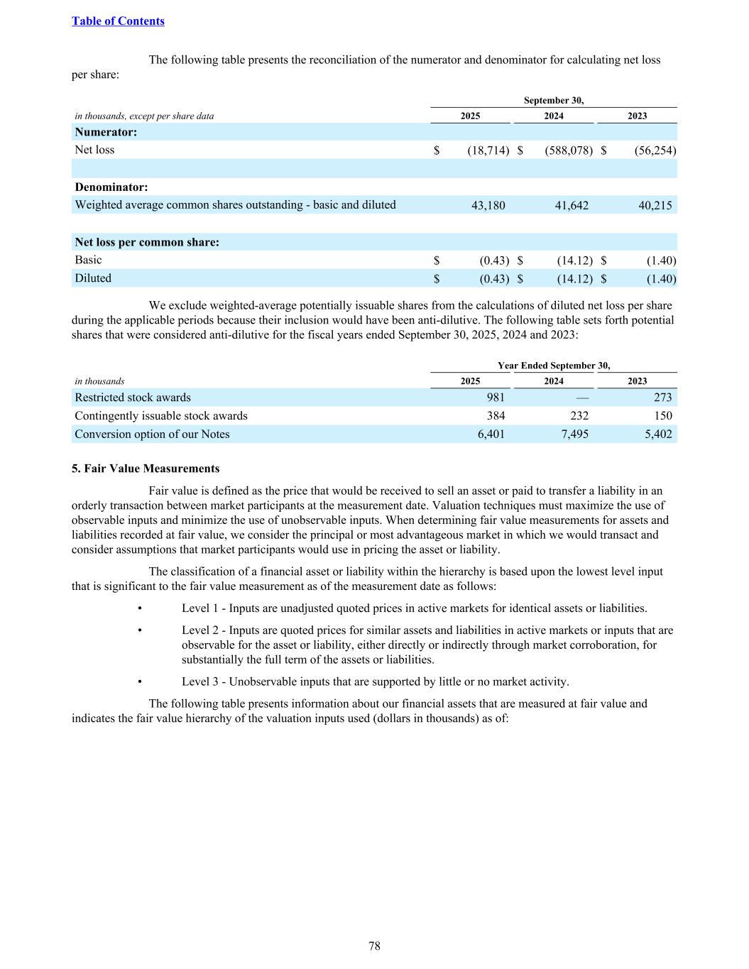 The following table presents the reconciliation of the numerator and denominator for calculating net loss per share: September 30, in thousands, except per share data 2025 2024 2023 Numerator: Net loss $ (18,714) $ (588,078) $ (56,254) Denominator: Weighted average common shares outstanding - basic and diluted 43,180 41,642 40,215 Net loss per common share: Basic $ (0.43) $ (14.12) $ (1.40) Diluted $ (0.43) $ (14.12) $ (1.40) We exclude weighted-average potentially issuable shares from the calculations of diluted net loss per share during the applicable periods because their inclusion would have been anti-dilutive. The following table sets forth potential shares that were considered anti-dilutive for the fiscal years ended September 30, 2025, 2024 and 2023: Year Ended September 30, in thousands 2025 2024 2023 Restricted stock awards 981 — 273 Contingently issuable stock awards 384 232 150 Conversion option of our Notes 6,401 7,495 5,402 5. Fair Value Measurements Fair value is defined as the price that would be received to sell an asset or paid to transfer a liability in an orderly transaction between market participants at the measurement date. Valuation techniques must maximize the use of observable inputs and minimize the use of unobservable inputs. When determining fair value measurements for assets and liabilities recorded at fair value, we consider the principal or most advantageous market in which we would transact and consider assumptions that market participants would use in pricing the asset or liability. The classification of a financial asset or liability within the hierarchy is based upon the lowest level input that is significant to the fair value measurement as of the measurement date as follows: • Level 1 - Inputs are unadjusted quoted prices in active markets for identical assets or liabilities. • Level 2 - Inputs are quoted prices for similar assets and liabilities in active markets or inputs that are observable for the asset or liability, either directly or indirectly through market corroboration, for substantially the full term of the assets or liabilities. • Level 3 - Unobservable inputs that are supported by little or no market activity. The following table presents information about our financial assets that are measured at fair value and indicates the fair value hierarchy of the valuation inputs used (dollars in thousands) as of: Table of Contents 78