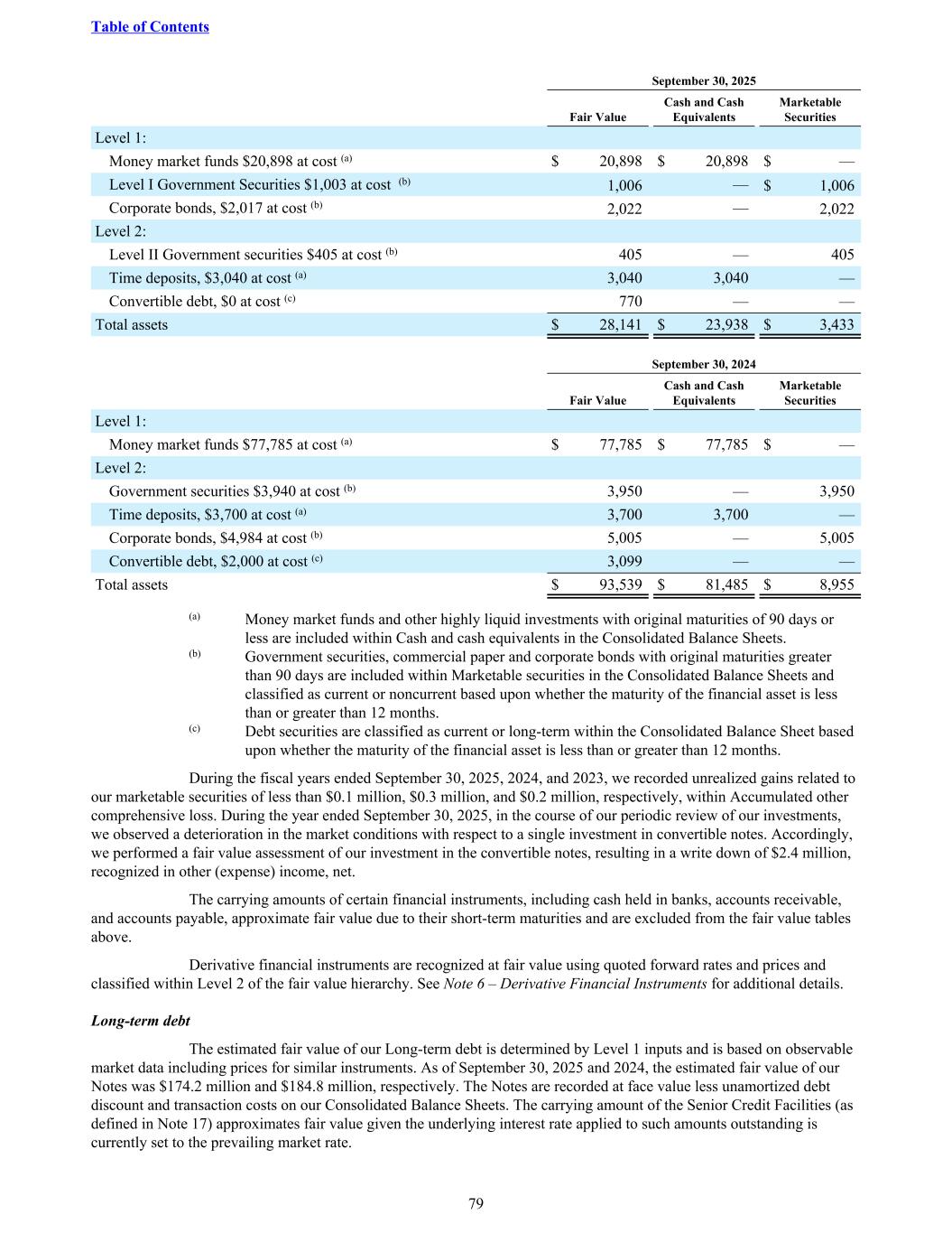 September 30, 2025 Fair Value Cash and Cash Equivalents Marketable Securities Level 1: Money market funds $20,898 at cost (a) $ 20,898 $ 20,898 $ — Level I Government Securities $1,003 at cost (b) 1,006 — $ 1,006 Corporate bonds, $2,017 at cost (b) 2,022 — 2,022 Level 2: Level II Government securities $405 at cost (b) 405 — 405 Time deposits, $3,040 at cost (a) 3,040 3,040 — Convertible debt, $0 at cost (c) 770 — — Total assets $ 28,141 $ 23,938 $ 3,433 September 30, 2024 Fair Value Cash and Cash Equivalents Marketable Securities Level 1: Money market funds $77,785 at cost (a) $ 77,785 $ 77,785 $ — Level 2: Government securities $3,940 at cost (b) 3,950 — 3,950 Time deposits, $3,700 at cost (a) 3,700 3,700 — Corporate bonds, $4,984 at cost (b) 5,005 — 5,005 Convertible debt, $2,000 at cost (c) 3,099 — — Total assets $ 93,539 $ 81,485 $ 8,955 (a) Money market funds and other highly liquid investments with original maturities of 90 days or less are included within Cash and cash equivalents in the Consolidated Balance Sheets. (b) Government securities, commercial paper and corporate bonds with original maturities greater than 90 days are included within Marketable securities in the Consolidated Balance Sheets and classified as current or noncurrent based upon whether the maturity of the financial asset is less than or greater than 12 months. (c) Debt securities are classified as current or long-term within the Consolidated Balance Sheet based upon whether the maturity of the financial asset is less than or greater than 12 months. During the fiscal years ended September 30, 2025, 2024, and 2023, we recorded unrealized gains related to our marketable securities of less than $0.1 million, $0.3 million, and $0.2 million, respectively, within Accumulated other comprehensive loss. During the year ended September 30, 2025, in the course of our periodic review of our investments, we observed a deterioration in the market conditions with respect to a single investment in convertible notes. Accordingly, we performed a fair value assessment of our investment in the convertible notes, resulting in a write down of $2.4 million, recognized in other (expense) income, net. The carrying amounts of certain financial instruments, including cash held in banks, accounts receivable, and accounts payable, approximate fair value due to their short-term maturities and are excluded from the fair value tables above. Derivative financial instruments are recognized at fair value using quoted forward rates and prices and classified within Level 2 of the fair value hierarchy. See Note 6 – Derivative Financial Instruments for additional details. Long-term debt The estimated fair value of our Long-term debt is determined by Level 1 inputs and is based on observable market data including prices for similar instruments. As of September 30, 2025 and 2024, the estimated fair value of our Notes was $174.2 million and $184.8 million, respectively. The Notes are recorded at face value less unamortized debt discount and transaction costs on our Consolidated Balance Sheets. The carrying amount of the Senior Credit Facilities (as defined in Note 17) approximates fair value given the underlying interest rate applied to such amounts outstanding is currently set to the prevailing market rate. Table of Contents 79