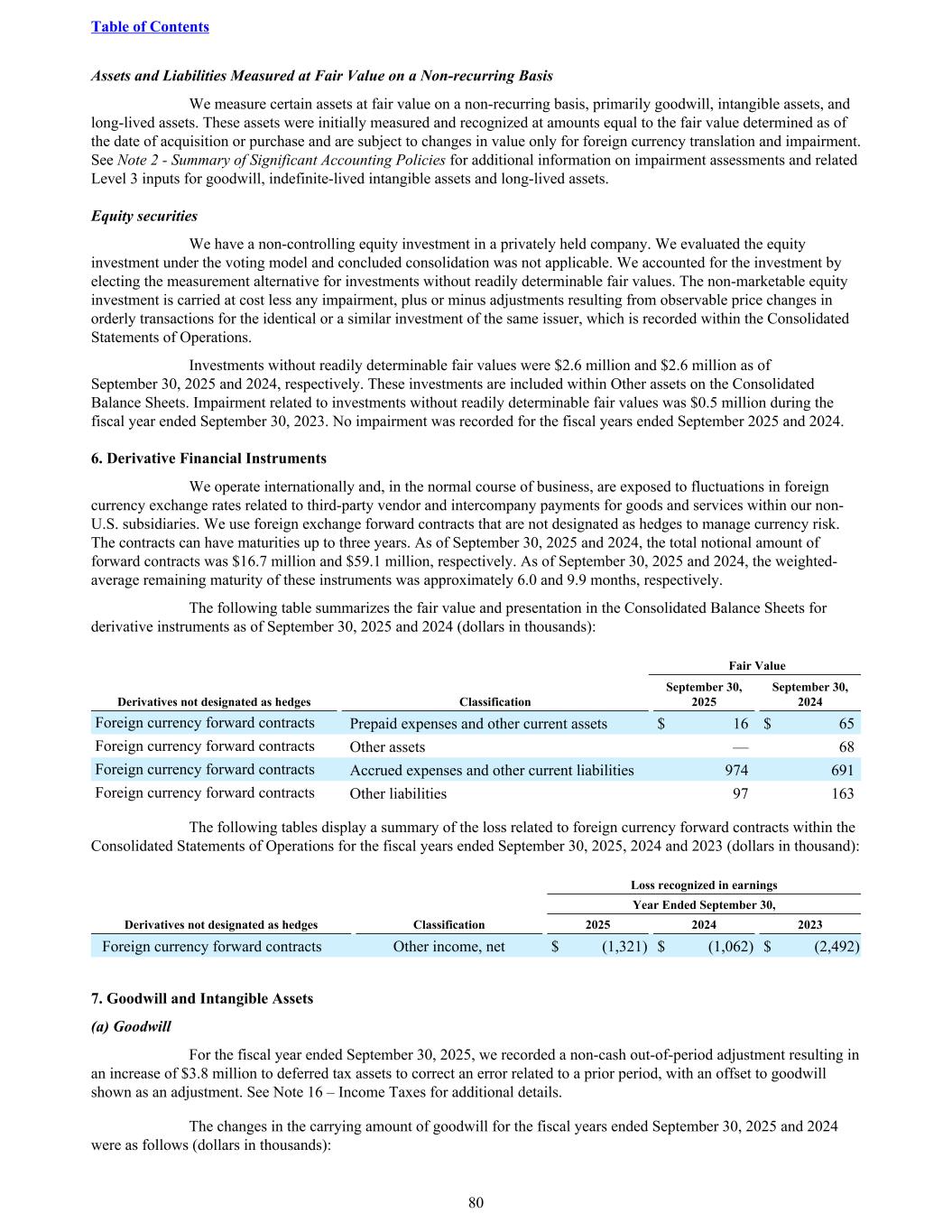 Assets and Liabilities Measured at Fair Value on a Non-recurring Basis We measure certain assets at fair value on a non-recurring basis, primarily goodwill, intangible assets, and long-lived assets. These assets were initially measured and recognized at amounts equal to the fair value determined as of the date of acquisition or purchase and are subject to changes in value only for foreign currency translation and impairment. See Note 2 - Summary of Significant Accounting Policies for additional information on impairment assessments and related Level 3 inputs for goodwill, indefinite-lived intangible assets and long-lived assets. Equity securities We have a non-controlling equity investment in a privately held company. We evaluated the equity investment under the voting model and concluded consolidation was not applicable. We accounted for the investment by electing the measurement alternative for investments without readily determinable fair values. The non-marketable equity investment is carried at cost less any impairment, plus or minus adjustments resulting from observable price changes in orderly transactions for the identical or a similar investment of the same issuer, which is recorded within the Consolidated Statements of Operations. Investments without readily determinable fair values were $2.6 million and $2.6 million as of September 30, 2025 and 2024, respectively. These investments are included within Other assets on the Consolidated Balance Sheets. Impairment related to investments without readily determinable fair values was $0.5 million during the fiscal year ended September 30, 2023. No impairment was recorded for the fiscal years ended September 2025 and 2024. 6. Derivative Financial Instruments We operate internationally and, in the normal course of business, are exposed to fluctuations in foreign currency exchange rates related to third-party vendor and intercompany payments for goods and services within our non- U.S. subsidiaries. We use foreign exchange forward contracts that are not designated as hedges to manage currency risk. The contracts can have maturities up to three years. As of September 30, 2025 and 2024, the total notional amount of forward contracts was $16.7 million and $59.1 million, respectively. As of September 30, 2025 and 2024, the weighted- average remaining maturity of these instruments was approximately 6.0 and 9.9 months, respectively. The following table summarizes the fair value and presentation in the Consolidated Balance Sheets for derivative instruments as of September 30, 2025 and 2024 (dollars in thousands): Fair Value Derivatives not designated as hedges Classification September 30, 2025 September 30, 2024 Foreign currency forward contracts Prepaid expenses and other current assets $ 16 $ 65 Foreign currency forward contracts Other assets — 68 Foreign currency forward contracts Accrued expenses and other current liabilities 974 691 Foreign currency forward contracts Other liabilities 97 163 The following tables display a summary of the loss related to foreign currency forward contracts within the Consolidated Statements of Operations for the fiscal years ended September 30, 2025, 2024 and 2023 (dollars in thousand): Loss recognized in earnings Year Ended September 30, Derivatives not designated as hedges Classification 2025 2024 2023 Foreign currency forward contracts Other income, net $ (1,321) $ (1,062) $ (2,492) 7. Goodwill and Intangible Assets (a) Goodwill For the fiscal year ended September 30, 2025, we recorded a non-cash out-of-period adjustment resulting in an increase of $3.8 million to deferred tax assets to correct an error related to a prior period, with an offset to goodwill shown as an adjustment. See Note 16 – Income Taxes for additional details. The changes in the carrying amount of goodwill for the fiscal years ended September 30, 2025 and 2024 were as follows (dollars in thousands): Table of Contents 80