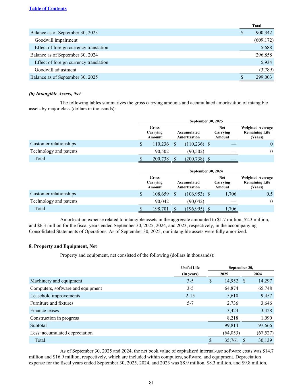 Total Balance as of September 30, 2023 $ 900,342 Goodwill impairment (609,172) Effect of foreign currency translation 5,688 Balance as of September 30, 2024 296,858 Effect of foreign currency translation 5,934 Goodwill adjustment (3,789) Balance as of September 30, 2025 $ 299,003 (b) Intangible Assets, Net The following tables summarizes the gross carrying amounts and accumulated amortization of intangible assets by major class (dollars in thousands): September 30, 2025 Gross Carrying Amount Accumulated Amortization Net Carrying Amount Weighted Average Remaining Life (Years) Customer relationships $ 110,236 $ (110,236) $ — 0 Technology and patents 90,502 (90,502) — 0 Total $ 200,738 $ (200,738) $ — September 30, 2024 Gross Carrying Amount Accumulated Amortization Net Carrying Amount Weighted Average Remaining Life (Years) Customer relationships $ 108,659 $ (106,953) $ 1,706 0.5 Technology and patents 90,042 (90,042) — 0 Total $ 198,701 $ (196,995) $ 1,706 Amortization expense related to intangible assets in the aggregate amounted to $1.7 million, $2.3 million, and $6.3 million for the fiscal years ended September 30, 2025, 2024, and 2023, respectively, in the accompanying Consolidated Statements of Operations. As of September 30, 2025, our intangible assets were fully amortized. 8. Property and Equipment, Net Property and equipment, net consisted of the following (dollars in thousands): Useful Life September 30, (In years) 2025 2024 Machinery and equipment 3-5 $ 14,952 $ 14,297 Computers, software and equipment 3-5 64,874 65,748 Leasehold improvements 2-15 5,610 9,457 Furniture and fixtures 5-7 2,736 3,646 Finance leases 3,424 3,428 Construction in progress 8,218 1,090 Subtotal 99,814 97,666 Less: accumulated depreciation (64,053) (67,527) Total $ 35,761 $ 30,139 As of September 30, 2025 and 2024, the net book value of capitalized internal-use software costs was $14.7 million and $16.9 million, respectively, which are included within computers, software, and equipment. Depreciation expense for the fiscal years ended September 30, 2025, 2024, and 2023 was $8.9 million, $8.3 million, and $9.8 million, Table of Contents 81