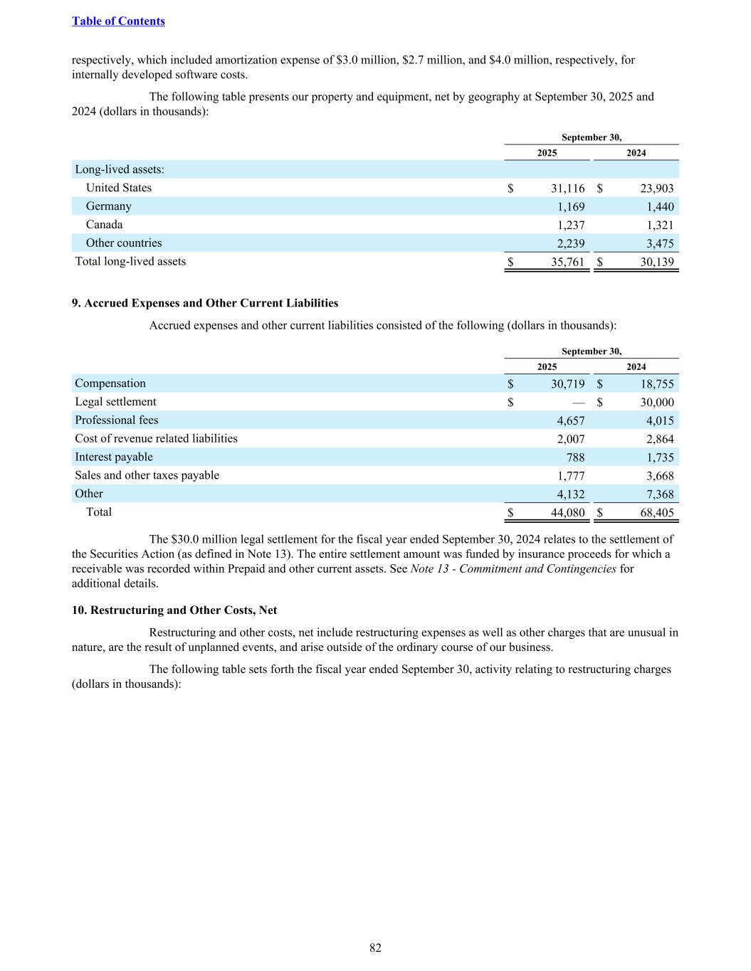 respectively, which included amortization expense of $3.0 million, $2.7 million, and $4.0 million, respectively, for internally developed software costs. The following table presents our property and equipment, net by geography at September 30, 2025 and 2024 (dollars in thousands): September 30, 2025 2024 Long-lived assets: United States $ 31,116 $ 23,903 Germany 1,169 1,440 Canada 1,237 1,321 Other countries 2,239 3,475 Total long-lived assets $ 35,761 $ 30,139 9. Accrued Expenses and Other Current Liabilities Accrued expenses and other current liabilities consisted of the following (dollars in thousands): September 30, 2025 2024 Compensation $ 30,719 $ 18,755 Legal settlement $ — $ 30,000 Professional fees 4,657 4,015 Cost of revenue related liabilities 2,007 2,864 Interest payable 788 1,735 Sales and other taxes payable 1,777 3,668 Other 4,132 7,368 Total $ 44,080 $ 68,405 The $30.0 million legal settlement for the fiscal year ended September 30, 2024 relates to the settlement of the Securities Action (as defined in Note 13). The entire settlement amount was funded by insurance proceeds for which a receivable was recorded within Prepaid and other current assets. See Note 13 - Commitment and Contingencies for additional details. 10. Restructuring and Other Costs, Net Restructuring and other costs, net include restructuring expenses as well as other charges that are unusual in nature, are the result of unplanned events, and arise outside of the ordinary course of our business. The following table sets forth the fiscal year ended September 30, activity relating to restructuring charges (dollars in thousands): Table of Contents 82