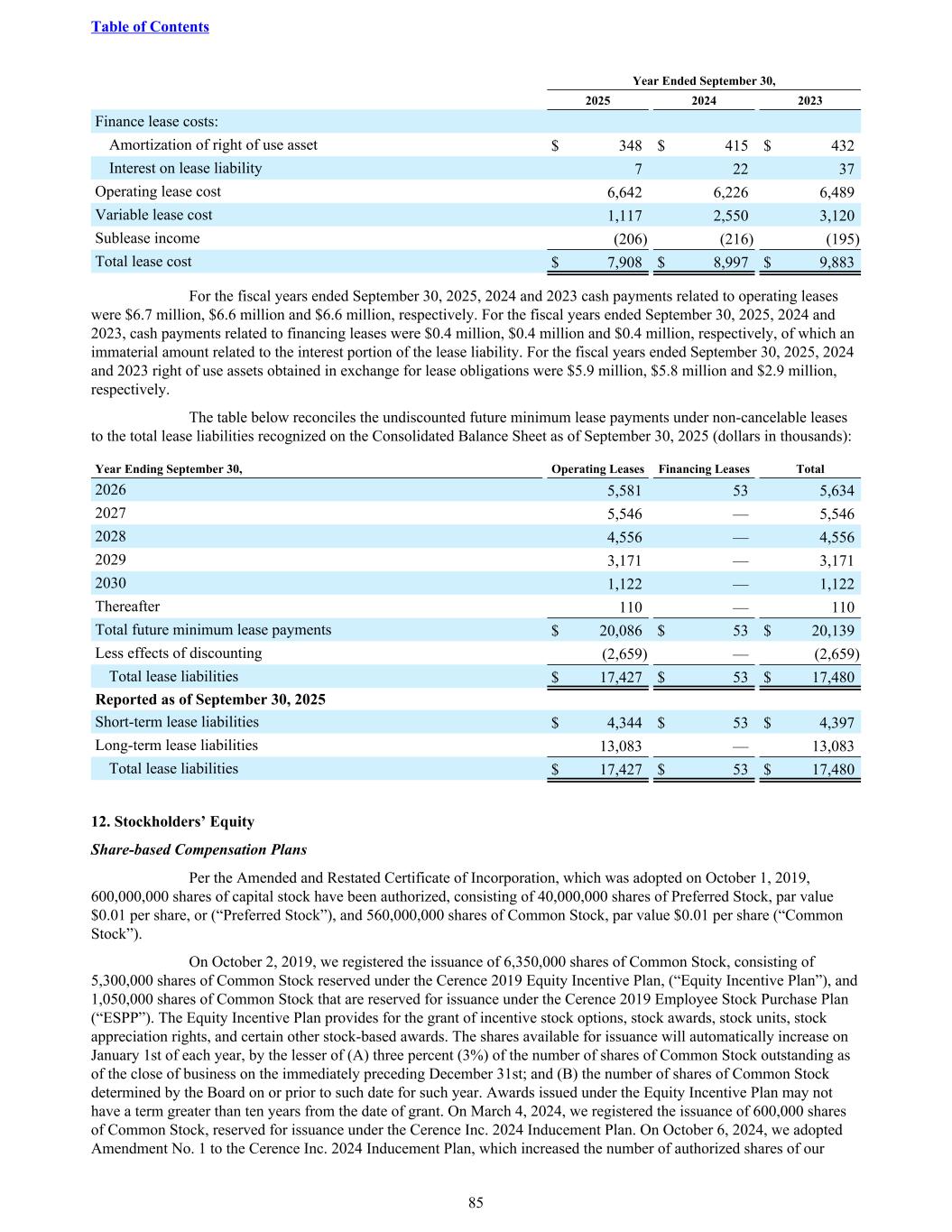 Year Ended September 30, 2025 2024 2023 Finance lease costs: Amortization of right of use asset $ 348 $ 415 $ 432 Interest on lease liability 7 22 37 Operating lease cost 6,642 6,226 6,489 Variable lease cost 1,117 2,550 3,120 Sublease income (206) (216) (195) Total lease cost $ 7,908 $ 8,997 $ 9,883 For the fiscal years ended September 30, 2025, 2024 and 2023 cash payments related to operating leases were $6.7 million, $6.6 million and $6.6 million, respectively. For the fiscal years ended September 30, 2025, 2024 and 2023, cash payments related to financing leases were $0.4 million, $0.4 million and $0.4 million, respectively, of which an immaterial amount related to the interest portion of the lease liability. For the fiscal years ended September 30, 2025, 2024 and 2023 right of use assets obtained in exchange for lease obligations were $5.9 million, $5.8 million and $2.9 million, respectively. The table below reconciles the undiscounted future minimum lease payments under non-cancelable leases to the total lease liabilities recognized on the Consolidated Balance Sheet as of September 30, 2025 (dollars in thousands): Year Ending September 30, Operating Leases Financing Leases Total 2026 5,581 53 5,634 2027 5,546 — 5,546 2028 4,556 — 4,556 2029 3,171 — 3,171 2030 1,122 — 1,122 Thereafter 110 — 110 Total future minimum lease payments $ 20,086 $ 53 $ 20,139 Less effects of discounting (2,659) — (2,659) Total lease liabilities $ 17,427 $ 53 $ 17,480 Reported as of September 30, 2025 Short-term lease liabilities $ 4,344 $ 53 $ 4,397 Long-term lease liabilities 13,083 — 13,083 Total lease liabilities $ 17,427 $ 53 $ 17,480 12. Stockholders’ Equity Share-based Compensation Plans Per the Amended and Restated Certificate of Incorporation, which was adopted on October 1, 2019, 600,000,000 shares of capital stock have been authorized, consisting of 40,000,000 shares of Preferred Stock, par value $0.01 per share, or (“Preferred Stock”), and 560,000,000 shares of Common Stock, par value $0.01 per share (“Common Stock”). On October 2, 2019, we registered the issuance of 6,350,000 shares of Common Stock, consisting of 5,300,000 shares of Common Stock reserved under the Cerence 2019 Equity Incentive Plan, (“Equity Incentive Plan”), and 1,050,000 shares of Common Stock that are reserved for issuance under the Cerence 2019 Employee Stock Purchase Plan (“ESPP”). The Equity Incentive Plan provides for the grant of incentive stock options, stock awards, stock units, stock appreciation rights, and certain other stock-based awards. The shares available for issuance will automatically increase on January 1st of each year, by the lesser of (A) three percent (3%) of the number of shares of Common Stock outstanding as of the close of business on the immediately preceding December 31st; and (B) the number of shares of Common Stock determined by the Board on or prior to such date for such year. Awards issued under the Equity Incentive Plan may not have a term greater than ten years from the date of grant. On March 4, 2024, we registered the issuance of 600,000 shares of Common Stock, reserved for issuance under the Cerence Inc. 2024 Inducement Plan. On October 6, 2024, we adopted Amendment No. 1 to the Cerence Inc. 2024 Inducement Plan, which increased the number of authorized shares of our Table of Contents 85