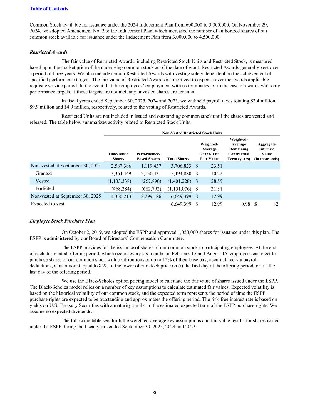 Common Stock available for issuance under the 2024 Inducement Plan from 600,000 to 3,000,000. On November 29, 2024, we adopted Amendment No. 2 to the Inducement Plan, which increased the number of authorized shares of our common stock available for issuance under the Inducement Plan from 3,000,000 to 4,500,000. Restricted Awards The fair value of Restricted Awards, including Restricted Stock Units and Restricted Stock, is measured based upon the market price of the underlying common stock as of the date of grant. Restricted Awards generally vest over a period of three years. We also include certain Restricted Awards with vesting solely dependent on the achievement of specified performance targets. The fair value of Restricted Awards is amortized to expense over the awards applicable requisite service period. In the event that the employees’ employment with us terminates, or in the case of awards with only performance targets, if those targets are not met, any unvested shares are forfeited. In fiscal years ended September 30, 2025, 2024 and 2023, we withheld payroll taxes totaling $2.4 million, $9.9 million and $4.9 million, respectively, related to the vesting of Restricted Awards. Restricted Units are not included in issued and outstanding common stock until the shares are vested and released. The table below summarizes activity related to Restricted Stock Units: Non-Vested Restricted Stock Units Time-Based Shares Performance- Based Shares Total Shares Weighted- Average Grant-Date Fair Value Weighted- Average Remaining Contractual Term (years) Aggregate Intrinsic Value (in thousands) Non-vested at September 30, 2024 2,587,386 1,119,437 3,706,823 $ 23.51 Granted 3,364,449 2,130,431 5,494,880 $ 10.22 Vested (1,133,338) (267,890) (1,401,228) $ 28.59 Forfeited (468,284) (682,792) (1,151,076) $ 21.31 Non-vested at September 30, 2025 4,350,213 2,299,186 6,649,399 $ 12.99 Expected to vest 6,649,399 $ 12.99 0.98 $ 82 Employee Stock Purchase Plan On October 2, 2019, we adopted the ESPP and approved 1,050,000 shares for issuance under this plan. The ESPP is administered by our Board of Directors’ Compensation Committee. The ESPP provides for the issuance of shares of our common stock to participating employees. At the end of each designated offering period, which occurs every six months on February 15 and August 15, employees can elect to purchase shares of our common stock with contributions of up to 12% of their base pay, accumulated via payroll deductions, at an amount equal to 85% of the lower of our stock price on (i) the first day of the offering period, or (ii) the last day of the offering period. We use the Black-Scholes option pricing model to calculate the fair value of shares issued under the ESPP. The Black-Scholes model relies on a number of key assumptions to calculate estimated fair values. Expected volatility is based on the historical volatility of our common stock, and the expected term represents the period of time the ESPP purchase rights are expected to be outstanding and approximates the offering period. The risk-free interest rate is based on yields on U.S. Treasury Securities with a maturity similar to the estimated expected term of the ESPP purchase rights. We assume no expected dividends. The following table sets forth the weighted-average key assumptions and fair value results for shares issued under the ESPP during the fiscal years ended September 30, 2025, 2024 and 2023: Table of Contents 86