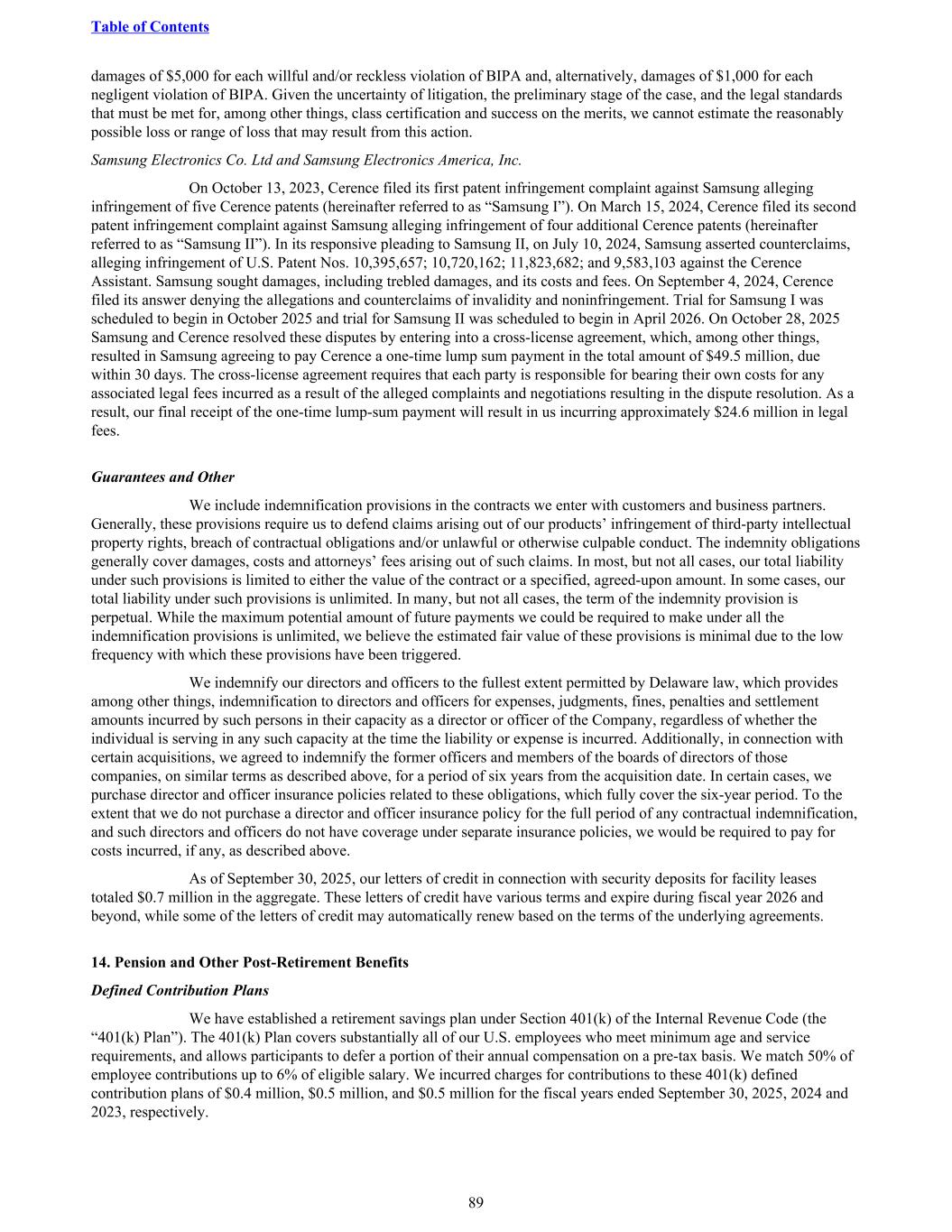 damages of $5,000 for each willful and/or reckless violation of BIPA and, alternatively, damages of $1,000 for each negligent violation of BIPA. Given the uncertainty of litigation, the preliminary stage of the case, and the legal standards that must be met for, among other things, class certification and success on the merits, we cannot estimate the reasonably possible loss or range of loss that may result from this action. Samsung Electronics Co. Ltd and Samsung Electronics America, Inc. On October 13, 2023, Cerence filed its first patent infringement complaint against Samsung alleging infringement of five Cerence patents (hereinafter referred to as “Samsung I”). On March 15, 2024, Cerence filed its second patent infringement complaint against Samsung alleging infringement of four additional Cerence patents (hereinafter referred to as “Samsung II”). In its responsive pleading to Samsung II, on July 10, 2024, Samsung asserted counterclaims, alleging infringement of U.S. Patent Nos. 10,395,657; 10,720,162; 11,823,682; and 9,583,103 against the Cerence Assistant. Samsung sought damages, including trebled damages, and its costs and fees. On September 4, 2024, Cerence filed its answer denying the allegations and counterclaims of invalidity and noninfringement. Trial for Samsung I was scheduled to begin in October 2025 and trial for Samsung II was scheduled to begin in April 2026. On October 28, 2025 Samsung and Cerence resolved these disputes by entering into a cross-license agreement, which, among other things, resulted in Samsung agreeing to pay Cerence a one-time lump sum payment in the total amount of $49.5 million, due within 30 days. The cross-license agreement requires that each party is responsible for bearing their own costs for any associated legal fees incurred as a result of the alleged complaints and negotiations resulting in the dispute resolution. As a result, our final receipt of the one-time lump-sum payment will result in us incurring approximately $24.6 million in legal fees. Guarantees and Other We include indemnification provisions in the contracts we enter with customers and business partners. Generally, these provisions require us to defend claims arising out of our products’ infringement of third-party intellectual property rights, breach of contractual obligations and/or unlawful or otherwise culpable conduct. The indemnity obligations generally cover damages, costs and attorneys’ fees arising out of such claims. In most, but not all cases, our total liability under such provisions is limited to either the value of the contract or a specified, agreed-upon amount. In some cases, our total liability under such provisions is unlimited. In many, but not all cases, the term of the indemnity provision is perpetual. While the maximum potential amount of future payments we could be required to make under all the indemnification provisions is unlimited, we believe the estimated fair value of these provisions is minimal due to the low frequency with which these provisions have been triggered. We indemnify our directors and officers to the fullest extent permitted by Delaware law, which provides among other things, indemnification to directors and officers for expenses, judgments, fines, penalties and settlement amounts incurred by such persons in their capacity as a director or officer of the Company, regardless of whether the individual is serving in any such capacity at the time the liability or expense is incurred. Additionally, in connection with certain acquisitions, we agreed to indemnify the former officers and members of the boards of directors of those companies, on similar terms as described above, for a period of six years from the acquisition date. In certain cases, we purchase director and officer insurance policies related to these obligations, which fully cover the six-year period. To the extent that we do not purchase a director and officer insurance policy for the full period of any contractual indemnification, and such directors and officers do not have coverage under separate insurance policies, we would be required to pay for costs incurred, if any, as described above. As of September 30, 2025, our letters of credit in connection with security deposits for facility leases totaled $0.7 million in the aggregate. These letters of credit have various terms and expire during fiscal year 2026 and beyond, while some of the letters of credit may automatically renew based on the terms of the underlying agreements. 14. Pension and Other Post-Retirement Benefits Defined Contribution Plans We have established a retirement savings plan under Section 401(k) of the Internal Revenue Code (the “401(k) Plan”). The 401(k) Plan covers substantially all of our U.S. employees who meet minimum age and service requirements, and allows participants to defer a portion of their annual compensation on a pre-tax basis. We match 50% of employee contributions up to 6% of eligible salary. We incurred charges for contributions to these 401(k) defined contribution plans of $0.4 million, $0.5 million, and $0.5 million for the fiscal years ended September 30, 2025, 2024 and 2023, respectively. Table of Contents 89