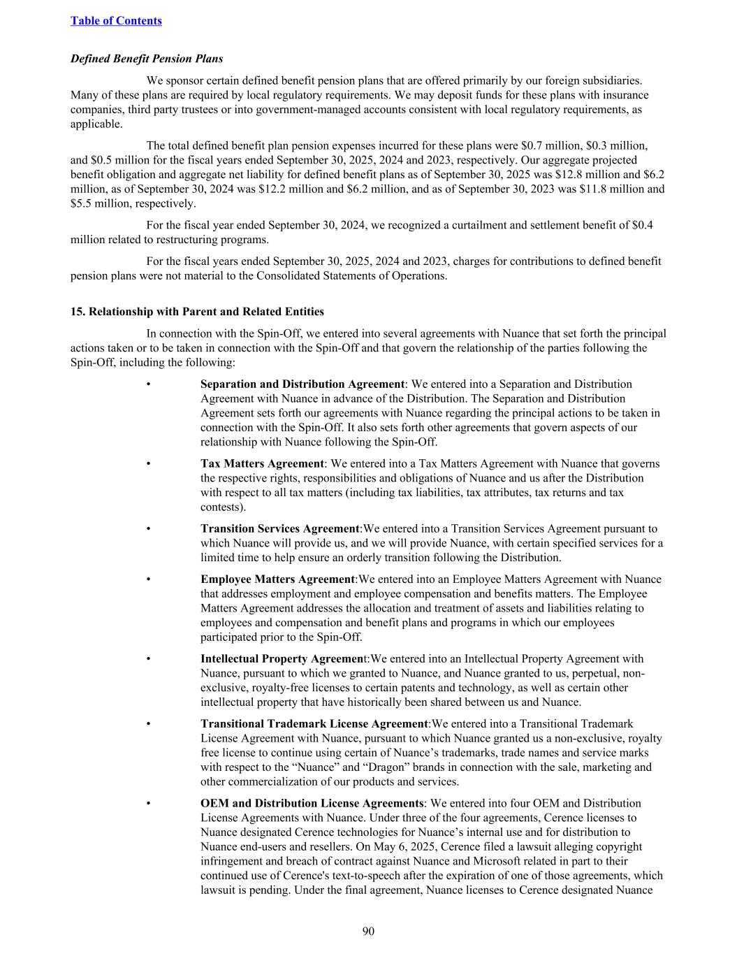 Defined Benefit Pension Plans We sponsor certain defined benefit pension plans that are offered primarily by our foreign subsidiaries. Many of these plans are required by local regulatory requirements. We may deposit funds for these plans with insurance companies, third party trustees or into government-managed accounts consistent with local regulatory requirements, as applicable. The total defined benefit plan pension expenses incurred for these plans were $0.7 million, $0.3 million, and $0.5 million for the fiscal years ended September 30, 2025, 2024 and 2023, respectively. Our aggregate projected benefit obligation and aggregate net liability for defined benefit plans as of September 30, 2025 was $12.8 million and $6.2 million, as of September 30, 2024 was $12.2 million and $6.2 million, and as of September 30, 2023 was $11.8 million and $5.5 million, respectively. For the fiscal year ended September 30, 2024, we recognized a curtailment and settlement benefit of $0.4 million related to restructuring programs. For the fiscal years ended September 30, 2025, 2024 and 2023, charges for contributions to defined benefit pension plans were not material to the Consolidated Statements of Operations. 15. Relationship with Parent and Related Entities In connection with the Spin-Off, we entered into several agreements with Nuance that set forth the principal actions taken or to be taken in connection with the Spin-Off and that govern the relationship of the parties following the Spin-Off, including the following: • Separation and Distribution Agreement: We entered into a Separation and Distribution Agreement with Nuance in advance of the Distribution. The Separation and Distribution Agreement sets forth our agreements with Nuance regarding the principal actions to be taken in connection with the Spin-Off. It also sets forth other agreements that govern aspects of our relationship with Nuance following the Spin-Off. • Tax Matters Agreement: We entered into a Tax Matters Agreement with Nuance that governs the respective rights, responsibilities and obligations of Nuance and us after the Distribution with respect to all tax matters (including tax liabilities, tax attributes, tax returns and tax contests). • Transition Services Agreement:We entered into a Transition Services Agreement pursuant to which Nuance will provide us, and we will provide Nuance, with certain specified services for a limited time to help ensure an orderly transition following the Distribution. • Employee Matters Agreement:We entered into an Employee Matters Agreement with Nuance that addresses employment and employee compensation and benefits matters. The Employee Matters Agreement addresses the allocation and treatment of assets and liabilities relating to employees and compensation and benefit plans and programs in which our employees participated prior to the Spin-Off. • Intellectual Property Agreement:We entered into an Intellectual Property Agreement with Nuance, pursuant to which we granted to Nuance, and Nuance granted to us, perpetual, non- exclusive, royalty-free licenses to certain patents and technology, as well as certain other intellectual property that have historically been shared between us and Nuance. • Transitional Trademark License Agreement:We entered into a Transitional Trademark License Agreement with Nuance, pursuant to which Nuance granted us a non-exclusive, royalty free license to continue using certain of Nuance’s trademarks, trade names and service marks with respect to the “Nuance” and “Dragon” brands in connection with the sale, marketing and other commercialization of our products and services. • OEM and Distribution License Agreements: We entered into four OEM and Distribution License Agreements with Nuance. Under three of the four agreements, Cerence licenses to Nuance designated Cerence technologies for Nuance’s internal use and for distribution to Nuance end-users and resellers. On May 6, 2025, Cerence filed a lawsuit alleging copyright infringement and breach of contract against Nuance and Microsoft related in part to their continued use of Cerence's text-to-speech after the expiration of one of those agreements, which lawsuit is pending. Under the final agreement, Nuance licenses to Cerence designated Nuance Table of Contents 90