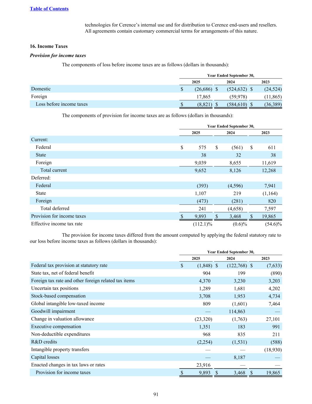technologies for Cerence’s internal use and for distribution to Cerence end-users and resellers. All agreements contain customary commercial terms for arrangements of this nature. 16. Income Taxes Provision for income taxes The components of loss before income taxes are as follows (dollars in thousands): Year Ended September 30, 2025 2024 2023 Domestic $ (26,686) $ (524,632) $ (24,524) Foreign 17,865 (59,978) (11,865) Loss before income taxes $ (8,821) $ (584,610) $ (36,389) The components of provision for income taxes are as follows (dollars in thousands): Year Ended September 30, 2025 2024 2023 Current: Federal $ 575 $ (561) $ 611 State 38 32 38 Foreign 9,039 8,655 11,619 Total current 9,652 8,126 12,268 Deferred: Federal (393) (4,596) 7,941 State 1,107 219 (1,164) Foreign (473) (281) 820 Total deferred 241 (4,658) 7,597 Provision for income taxes $ 9,893 $ 3,468 $ 19,865 Effective income tax rate (112.1) % (0.6) % (54.6) % The provision for income taxes differed from the amount computed by applying the federal statutory rate to our loss before income taxes as follows (dollars in thousands): Year Ended September 30, 2025 2024 2023 Federal tax provision at statutory rate $ (1,848) $ (122,768) $ (7,633) State tax, net of federal benefit 904 199 (890) Foreign tax rate and other foreign related tax items 4,370 3,230 3,203 Uncertain tax positions 1,289 1,681 4,202 Stock-based compensation 3,708 1,953 4,734 Global intangible low-taxed income 809 (1,601) 7,464 Goodwill impairment — 114,863 — Change in valuation allowance (23,320) (1,763) 27,101 Executive compensation 1,351 183 991 Non-deductible expenditures 968 835 211 R&D credits (2,254) (1,531) (588) Intangible property transfers — — (18,930) Capital losses — 8,187 — Enacted changes in tax laws or rates 23,916 — — Provision for income taxes $ 9,893 $ 3,468 $ 19,865 Table of Contents 91