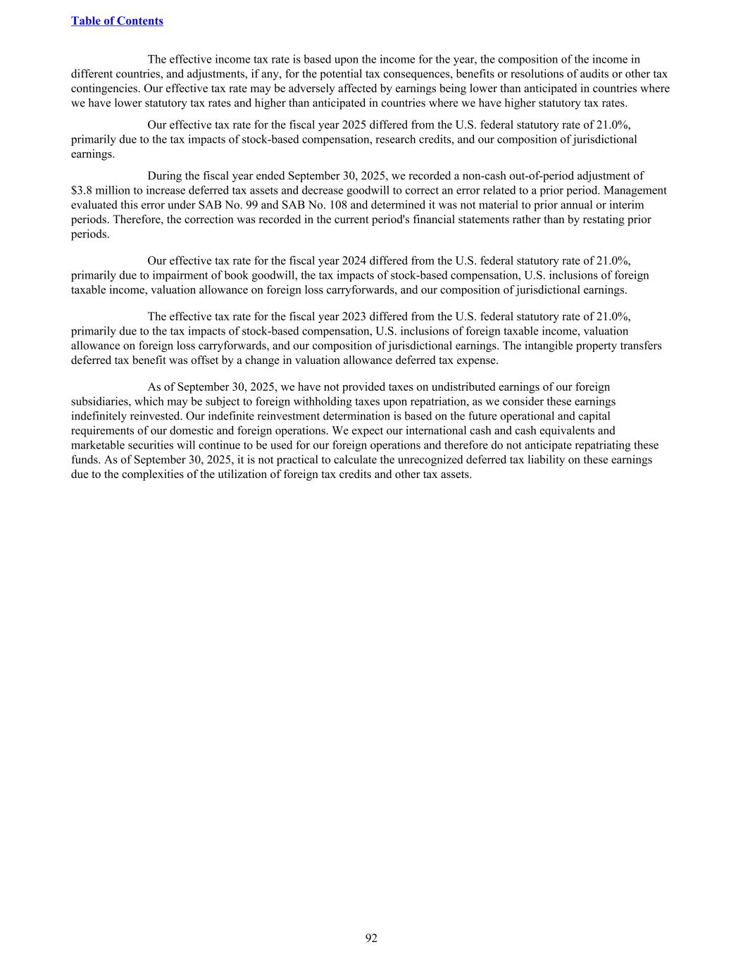 The effective income tax rate is based upon the income for the year, the composition of the income in different countries, and adjustments, if any, for the potential tax consequences, benefits or resolutions of audits or other tax contingencies. Our effective tax rate may be adversely affected by earnings being lower than anticipated in countries where we have lower statutory tax rates and higher than anticipated in countries where we have higher statutory tax rates. Our effective tax rate for the fiscal year 2025 differed from the U.S. federal statutory rate of 21.0%, primarily due to the tax impacts of stock-based compensation, research credits, and our composition of jurisdictional earnings. During the fiscal year ended September 30, 2025, we recorded a non-cash out-of-period adjustment of $3.8 million to increase deferred tax assets and decrease goodwill to correct an error related to a prior period. Management evaluated this error under SAB No. 99 and SAB No. 108 and determined it was not material to prior annual or interim periods. Therefore, the correction was recorded in the current period's financial statements rather than by restating prior periods. Our effective tax rate for the fiscal year 2024 differed from the U.S. federal statutory rate of 21.0%, primarily due to impairment of book goodwill, the tax impacts of stock-based compensation, U.S. inclusions of foreign taxable income, valuation allowance on foreign loss carryforwards, and our composition of jurisdictional earnings. The effective tax rate for the fiscal year 2023 differed from the U.S. federal statutory rate of 21.0%, primarily due to the tax impacts of stock-based compensation, U.S. inclusions of foreign taxable income, valuation allowance on foreign loss carryforwards, and our composition of jurisdictional earnings. The intangible property transfers deferred tax benefit was offset by a change in valuation allowance deferred tax expense. As of September 30, 2025, we have not provided taxes on undistributed earnings of our foreign subsidiaries, which may be subject to foreign withholding taxes upon repatriation, as we consider these earnings indefinitely reinvested. Our indefinite reinvestment determination is based on the future operational and capital requirements of our domestic and foreign operations. We expect our international cash and cash equivalents and marketable securities will continue to be used for our foreign operations and therefore do not anticipate repatriating these funds. As of September 30, 2025, it is not practical to calculate the unrecognized deferred tax liability on these earnings due to the complexities of the utilization of foreign tax credits and other tax assets. Table of Contents 92