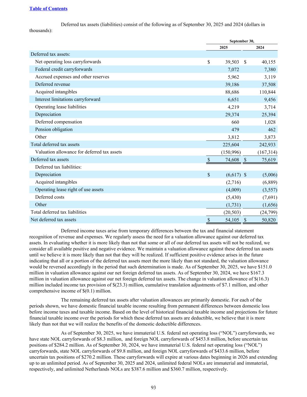 Deferred tax assets (liabilities) consist of the following as of September 30, 2025 and 2024 (dollars in thousands): September 30, 2025 2024 Deferred tax assets: Net operating loss carryforwards $ 39,503 $ 40,155 Federal credit carryforwards 7,072 7,380 Accrued expenses and other reserves 5,962 3,119 Deferred revenue 39,186 37,508 Acquired intangibles 88,686 110,844 Interest limitations carryforward 6,651 9,456 Operating lease liabilities 4,219 3,714 Depreciation 29,374 25,394 Deferred compensation 660 1,028 Pension obligation 479 462 Other 3,812 3,873 Total deferred tax assets 225,604 242,933 Valuation allowance for deferred tax assets (150,996) (167,314) Deferred tax assets $ 74,608 $ 75,619 Deferred tax liabilities: Depreciation $ (6,617) $ (5,006) Acquired intangibles (2,716) (6,889) Operating lease right of use assets (4,009) (3,557) Deferred costs (5,430) (7,691) Other (1,731) (1,656) Total deferred tax liabilities (20,503) (24,799) Net deferred tax assets $ 54,105 $ 50,820 Deferred income taxes arise from temporary differences between the tax and financial statement recognition of revenue and expenses. We regularly assess the need for a valuation allowance against our deferred tax assets. In evaluating whether it is more likely than not that some or all of our deferred tax assets will not be realized, we consider all available positive and negative evidence. We maintain a valuation allowance against these deferred tax assets until we believe it is more likely than not that they will be realized. If sufficient positive evidence arises in the future indicating that all or a portion of the deferred tax assets meet the more likely than not standard, the valuation allowance would be reversed accordingly in the period that such determination is made. As of September 30, 2025, we have $151.0 million in valuation allowance against our net foreign deferred tax assets. As of September 30, 2024, we have $167.3 million in valuation allowance against our net foreign deferred tax assets. The change in valuation allowance of $(16.3) million included income tax provision of $(23.3) million, cumulative translation adjustments of $7.1 million, and other comprehensive income of $(0.1) million. The remaining deferred tax assets after valuation allowances are primarily domestic. For each of the periods shown, we have domestic financial taxable income resulting from permanent differences between domestic loss before income taxes and taxable income. Based on the level of historical financial taxable income and projections for future financial taxable income over the periods for which these deferred tax assets are deductible, we believe that it is more likely than not that we will realize the benefits of the domestic deductible differences. As of September 30, 2025, we have immaterial U.S. federal net operating loss (“NOL”) carryforwards, we have state NOL carryforwards of $8.3 million, and foreign NOL carryforwards of $453.8 million, before uncertain tax positions of $284.2 million. As of September 30, 2024, we have immaterial U.S. federal net operating loss (“NOL”) carryforwards, state NOL carryforwards of $9.8 million, and foreign NOL carryforwards of $433.6 million, before uncertain tax positions of $270.2 million. These carryforwards will expire at various dates beginning in 2026 and extending up to an unlimited period. As of September 30, 2025 and 2024, unlimited federal NOLs are immaterial and immaterial, respectively, and unlimited Netherlands NOLs are $387.6 million and $360.7 million, respectively. Table of Contents 93