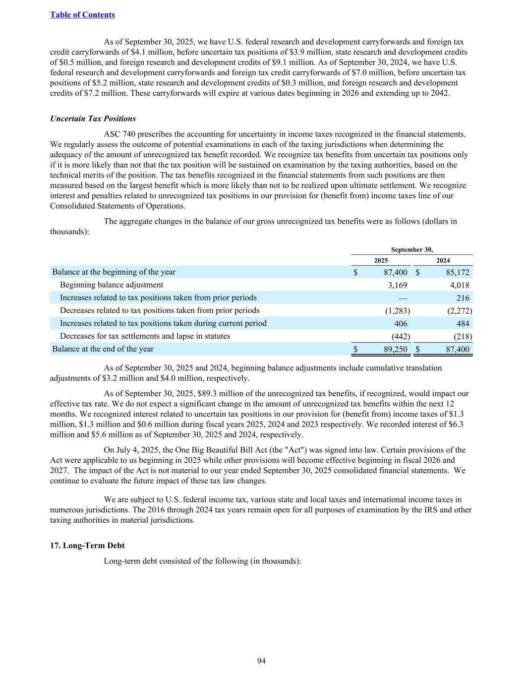 As of September 30, 2025, we have U.S. federal research and development carryforwards and foreign tax credit carryforwards of $4.1 million, before uncertain tax positions of $3.9 million, state research and development credits of $0.5 million, and foreign research and development credits of $9.1 million. As of September 30, 2024, we have U.S. federal research and development carryforwards and foreign tax credit carryforwards of $7.0 million, before uncertain tax positions of $5.2 million, state research and development credits of $0.3 million, and foreign research and development credits of $7.2 million. These carryforwards will expire at various dates beginning in 2026 and extending up to 2042. Uncertain Tax Positions ASC 740 prescribes the accounting for uncertainty in income taxes recognized in the financial statements. We regularly assess the outcome of potential examinations in each of the taxing jurisdictions when determining the adequacy of the amount of unrecognized tax benefit recorded. We recognize tax benefits from uncertain tax positions only if it is more likely than not that the tax position will be sustained on examination by the taxing authorities, based on the technical merits of the position. The tax benefits recognized in the financial statements from such positions are then measured based on the largest benefit which is more likely than not to be realized upon ultimate settlement. We recognize interest and penalties related to unrecognized tax positions in our provision for (benefit from) income taxes line of our Consolidated Statements of Operations. The aggregate changes in the balance of our gross unrecognized tax benefits were as follows (dollars in thousands): September 30, 2025 2024 Balance at the beginning of the year $ 87,400 $ 85,172 Beginning balance adjustment 3,169 4,018 Increases related to tax positions taken from prior periods — 216 Decreases related to tax positions taken from prior periods (1,283) (2,272) Increases related to tax positions taken during current period 406 484 Decreases for tax settlements and lapse in statutes (442) (218) Balance at the end of the year $ 89,250 $ 87,400 As of September 30, 2025 and 2024, beginning balance adjustments include cumulative translation adjustments of $3.2 million and $4.0 million, respectively. As of September 30, 2025, $89.3 million of the unrecognized tax benefits, if recognized, would impact our effective tax rate. We do not expect a significant change in the amount of unrecognized tax benefits within the next 12 months. We recognized interest related to uncertain tax positions in our provision for (benefit from) income taxes of $1.3 million, $1.3 million and $0.6 million during fiscal years 2025, 2024 and 2023 respectively. We recorded interest of $6.3 million and $5.6 million as of September 30, 2025 and 2024, respectively. On July 4, 2025, the One Big Beautiful Bill Act (the "Act") was signed into law. Certain provisions of the Act were applicable to us beginning in 2025 while other provisions will become effective beginning in fiscal 2026 and 2027. The impact of the Act is not material to our year ended September 30, 2025 consolidated financial statements. We continue to evaluate the future impact of these tax law changes. We are subject to U.S. federal income tax, various state and local taxes and international income taxes in numerous jurisdictions. The 2016 through 2024 tax years remain open for all purposes of examination by the IRS and other taxing authorities in material jurisdictions. 17. Long-Term Debt Long-term debt consisted of the following (in thousands): Table of Contents 94