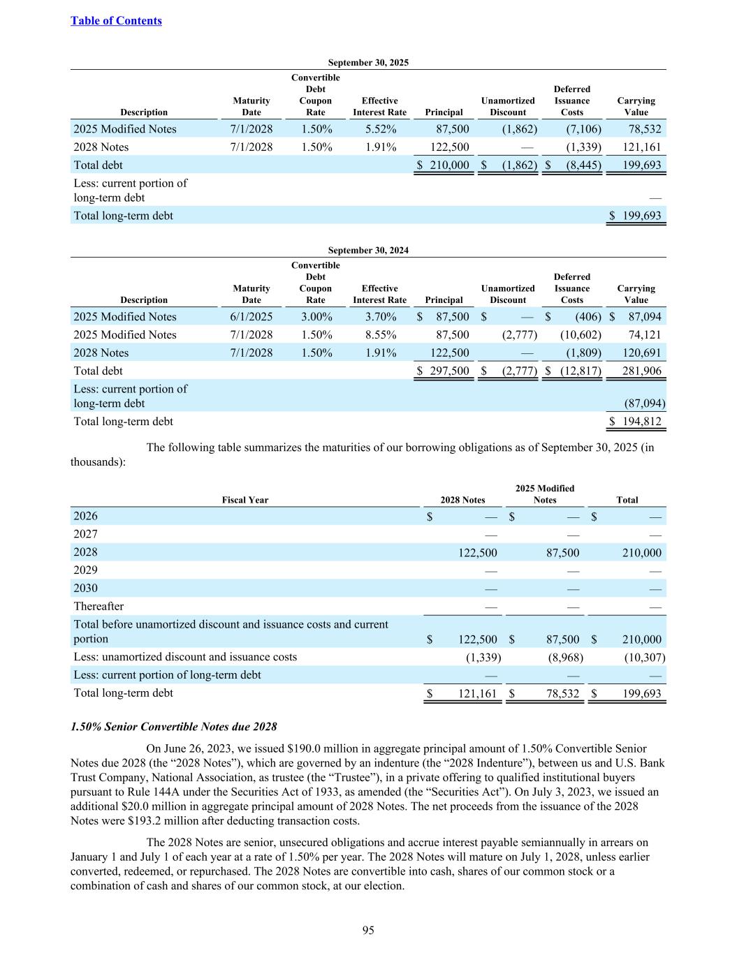 September 30, 2025 Description Maturity Date Convertible Debt Coupon Rate Effective Interest Rate Principal Unamortized Discount Deferred Issuance Costs Carrying Value 2025 Modified Notes 7/1/2028 1.50% 5.52% 87,500 (1,862) (7,106) 78,532 2028 Notes 7/1/2028 1.50% 1.91% 122,500 — (1,339) 121,161 Total debt $ 210,000 $ (1,862) $ (8,445) 199,693 Less: current portion of long-term debt — Total long-term debt $ 199,693 September 30, 2024 Description Maturity Date Convertible Debt Coupon Rate Effective Interest Rate Principal Unamortized Discount Deferred Issuance Costs Carrying Value 2025 Modified Notes 6/1/2025 3.00% 3.70% $ 87,500 $ — $ (406) $ 87,094 2025 Modified Notes 7/1/2028 1.50% 8.55% 87,500 (2,777) (10,602) 74,121 2028 Notes 7/1/2028 1.50% 1.91% 122,500 — (1,809) 120,691 Total debt $ 297,500 $ (2,777) $ (12,817) 281,906 Less: current portion of long-term debt (87,094) Total long-term debt $ 194,812 The following table summarizes the maturities of our borrowing obligations as of September 30, 2025 (in thousands): Fiscal Year 2028 Notes 2025 Modified Notes Total 2026 $ — $ — $ — 2027 — — — 2028 122,500 87,500 210,000 2029 — — — 2030 — — — Thereafter — — — Total before unamortized discount and issuance costs and current portion $ 122,500 $ 87,500 $ 210,000 Less: unamortized discount and issuance costs (1,339) (8,968) (10,307) Less: current portion of long-term debt — — — Total long-term debt $ 121,161 $ 78,532 $ 199,693 1.50% Senior Convertible Notes due 2028 On June 26, 2023, we issued $190.0 million in aggregate principal amount of 1.50% Convertible Senior Notes due 2028 (the “2028 Notes”), which are governed by an indenture (the “2028 Indenture”), between us and U.S. Bank Trust Company, National Association, as trustee (the “Trustee”), in a private offering to qualified institutional buyers pursuant to Rule 144A under the Securities Act of 1933, as amended (the “Securities Act”). On July 3, 2023, we issued an additional $20.0 million in aggregate principal amount of 2028 Notes. The net proceeds from the issuance of the 2028 Notes were $193.2 million after deducting transaction costs. The 2028 Notes are senior, unsecured obligations and accrue interest payable semiannually in arrears on January 1 and July 1 of each year at a rate of 1.50% per year. The 2028 Notes will mature on July 1, 2028, unless earlier converted, redeemed, or repurchased. The 2028 Notes are convertible into cash, shares of our common stock or a combination of cash and shares of our common stock, at our election. Table of Contents 95