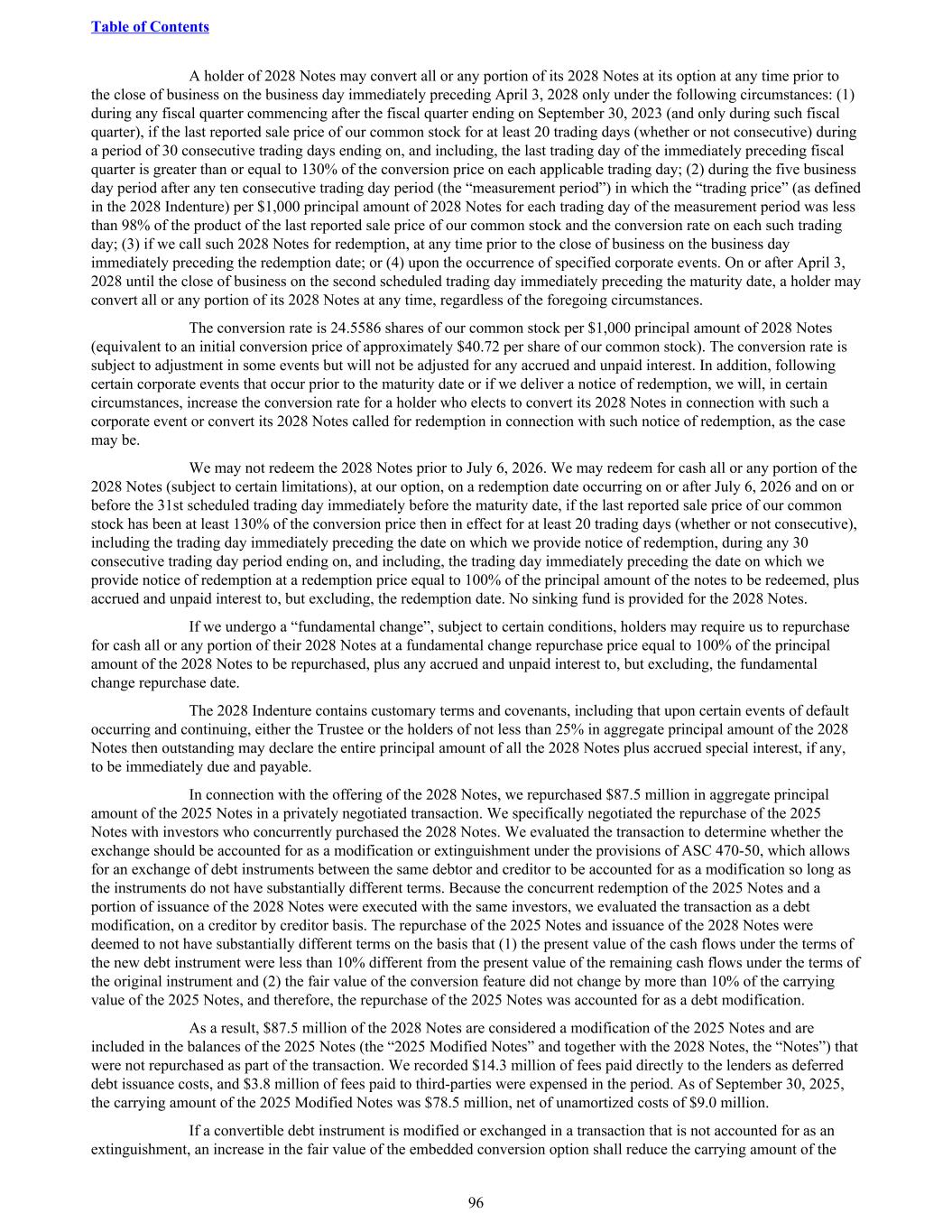 A holder of 2028 Notes may convert all or any portion of its 2028 Notes at its option at any time prior to the close of business on the business day immediately preceding April 3, 2028 only under the following circumstances: (1) during any fiscal quarter commencing after the fiscal quarter ending on September 30, 2023 (and only during such fiscal quarter), if the last reported sale price of our common stock for at least 20 trading days (whether or not consecutive) during a period of 30 consecutive trading days ending on, and including, the last trading day of the immediately preceding fiscal quarter is greater than or equal to 130% of the conversion price on each applicable trading day; (2) during the five business day period after any ten consecutive trading day period (the “measurement period”) in which the “trading price” (as defined in the 2028 Indenture) per $1,000 principal amount of 2028 Notes for each trading day of the measurement period was less than 98% of the product of the last reported sale price of our common stock and the conversion rate on each such trading day; (3) if we call such 2028 Notes for redemption, at any time prior to the close of business on the business day immediately preceding the redemption date; or (4) upon the occurrence of specified corporate events. On or after April 3, 2028 until the close of business on the second scheduled trading day immediately preceding the maturity date, a holder may convert all or any portion of its 2028 Notes at any time, regardless of the foregoing circumstances. The conversion rate is 24.5586 shares of our common stock per $1,000 principal amount of 2028 Notes (equivalent to an initial conversion price of approximately $40.72 per share of our common stock). The conversion rate is subject to adjustment in some events but will not be adjusted for any accrued and unpaid interest. In addition, following certain corporate events that occur prior to the maturity date or if we deliver a notice of redemption, we will, in certain circumstances, increase the conversion rate for a holder who elects to convert its 2028 Notes in connection with such a corporate event or convert its 2028 Notes called for redemption in connection with such notice of redemption, as the case may be. We may not redeem the 2028 Notes prior to July 6, 2026. We may redeem for cash all or any portion of the 2028 Notes (subject to certain limitations), at our option, on a redemption date occurring on or after July 6, 2026 and on or before the 31st scheduled trading day immediately before the maturity date, if the last reported sale price of our common stock has been at least 130% of the conversion price then in effect for at least 20 trading days (whether or not consecutive), including the trading day immediately preceding the date on which we provide notice of redemption, during any 30 consecutive trading day period ending on, and including, the trading day immediately preceding the date on which we provide notice of redemption at a redemption price equal to 100% of the principal amount of the notes to be redeemed, plus accrued and unpaid interest to, but excluding, the redemption date. No sinking fund is provided for the 2028 Notes. If we undergo a “fundamental change”, subject to certain conditions, holders may require us to repurchase for cash all or any portion of their 2028 Notes at a fundamental change repurchase price equal to 100% of the principal amount of the 2028 Notes to be repurchased, plus any accrued and unpaid interest to, but excluding, the fundamental change repurchase date. The 2028 Indenture contains customary terms and covenants, including that upon certain events of default occurring and continuing, either the Trustee or the holders of not less than 25% in aggregate principal amount of the 2028 Notes then outstanding may declare the entire principal amount of all the 2028 Notes plus accrued special interest, if any, to be immediately due and payable. In connection with the offering of the 2028 Notes, we repurchased $87.5 million in aggregate principal amount of the 2025 Notes in a privately negotiated transaction. We specifically negotiated the repurchase of the 2025 Notes with investors who concurrently purchased the 2028 Notes. We evaluated the transaction to determine whether the exchange should be accounted for as a modification or extinguishment under the provisions of ASC 470-50, which allows for an exchange of debt instruments between the same debtor and creditor to be accounted for as a modification so long as the instruments do not have substantially different terms. Because the concurrent redemption of the 2025 Notes and a portion of issuance of the 2028 Notes were executed with the same investors, we evaluated the transaction as a debt modification, on a creditor by creditor basis. The repurchase of the 2025 Notes and issuance of the 2028 Notes were deemed to not have substantially different terms on the basis that (1) the present value of the cash flows under the terms of the new debt instrument were less than 10% different from the present value of the remaining cash flows under the terms of the original instrument and (2) the fair value of the conversion feature did not change by more than 10% of the carrying value of the 2025 Notes, and therefore, the repurchase of the 2025 Notes was accounted for as a debt modification. As a result, $87.5 million of the 2028 Notes are considered a modification of the 2025 Notes and are included in the balances of the 2025 Notes (the “2025 Modified Notes” and together with the 2028 Notes, the “Notes”) that were not repurchased as part of the transaction. We recorded $14.3 million of fees paid directly to the lenders as deferred debt issuance costs, and $3.8 million of fees paid to third-parties were expensed in the period. As of September 30, 2025, the carrying amount of the 2025 Modified Notes was $78.5 million, net of unamortized costs of $9.0 million. If a convertible d