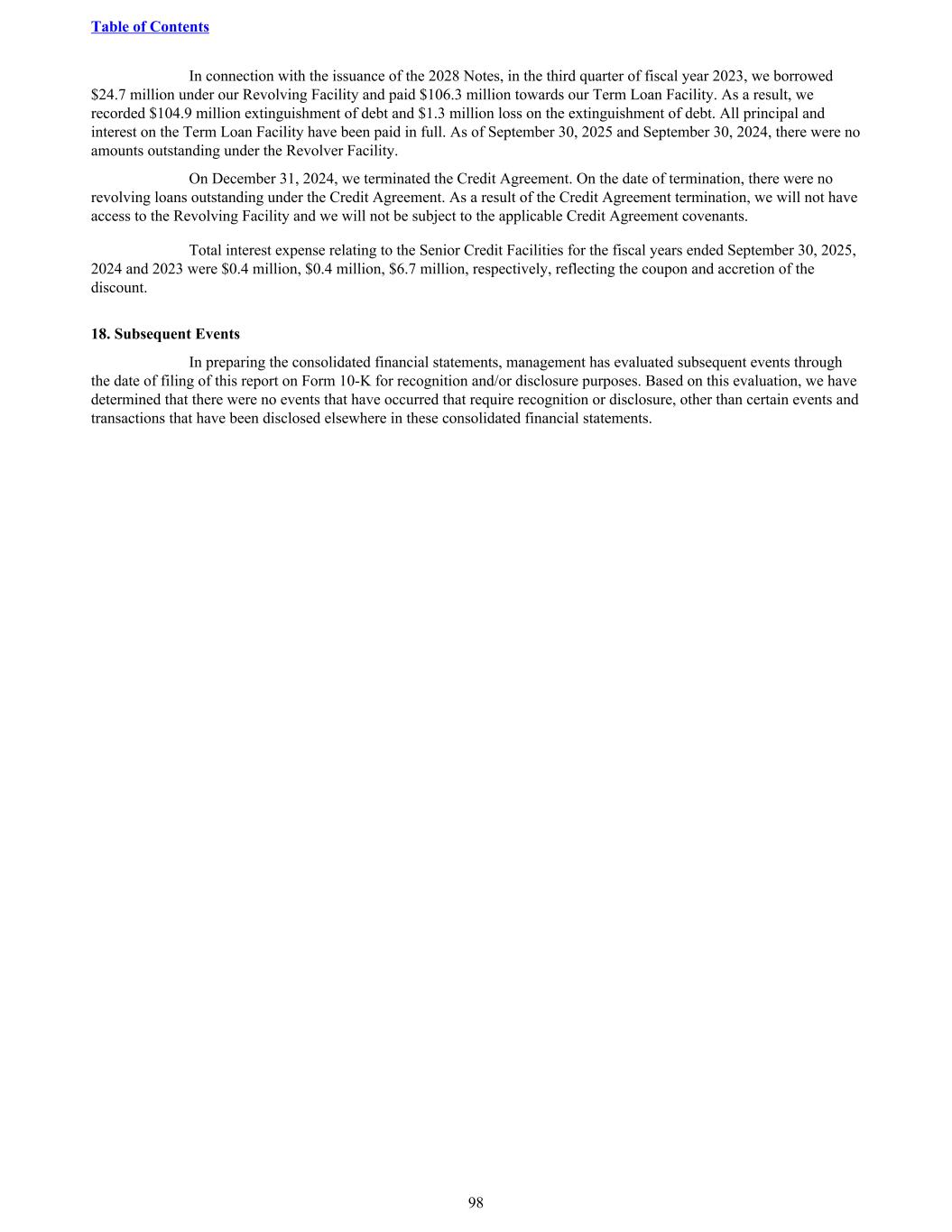 In connection with the issuance of the 2028 Notes, in the third quarter of fiscal year 2023, we borrowed $24.7 million under our Revolving Facility and paid $106.3 million towards our Term Loan Facility. As a result, we recorded $104.9 million extinguishment of debt and $1.3 million loss on the extinguishment of debt. All principal and interest on the Term Loan Facility have been paid in full. As of September 30, 2025 and September 30, 2024, there were no amounts outstanding under the Revolver Facility. On December 31, 2024, we terminated the Credit Agreement. On the date of termination, there were no revolving loans outstanding under the Credit Agreement. As a result of the Credit Agreement termination, we will not have access to the Revolving Facility and we will not be subject to the applicable Credit Agreement covenants. Total interest expense relating to the Senior Credit Facilities for the fiscal years ended September 30, 2025, 2024 and 2023 were $0.4 million, $0.4 million, $6.7 million, respectively, reflecting the coupon and accretion of the discount. 18. Subsequent Events In preparing the consolidated financial statements, management has evaluated subsequent events through the date of filing of this report on Form 10-K for recognition and/or disclosure purposes. Based on this evaluation, we have determined that there were no events that have occurred that require recognition or disclosure, other than certain events and transactions that have been disclosed elsewhere in these consolidated financial statements. Table of Contents 98