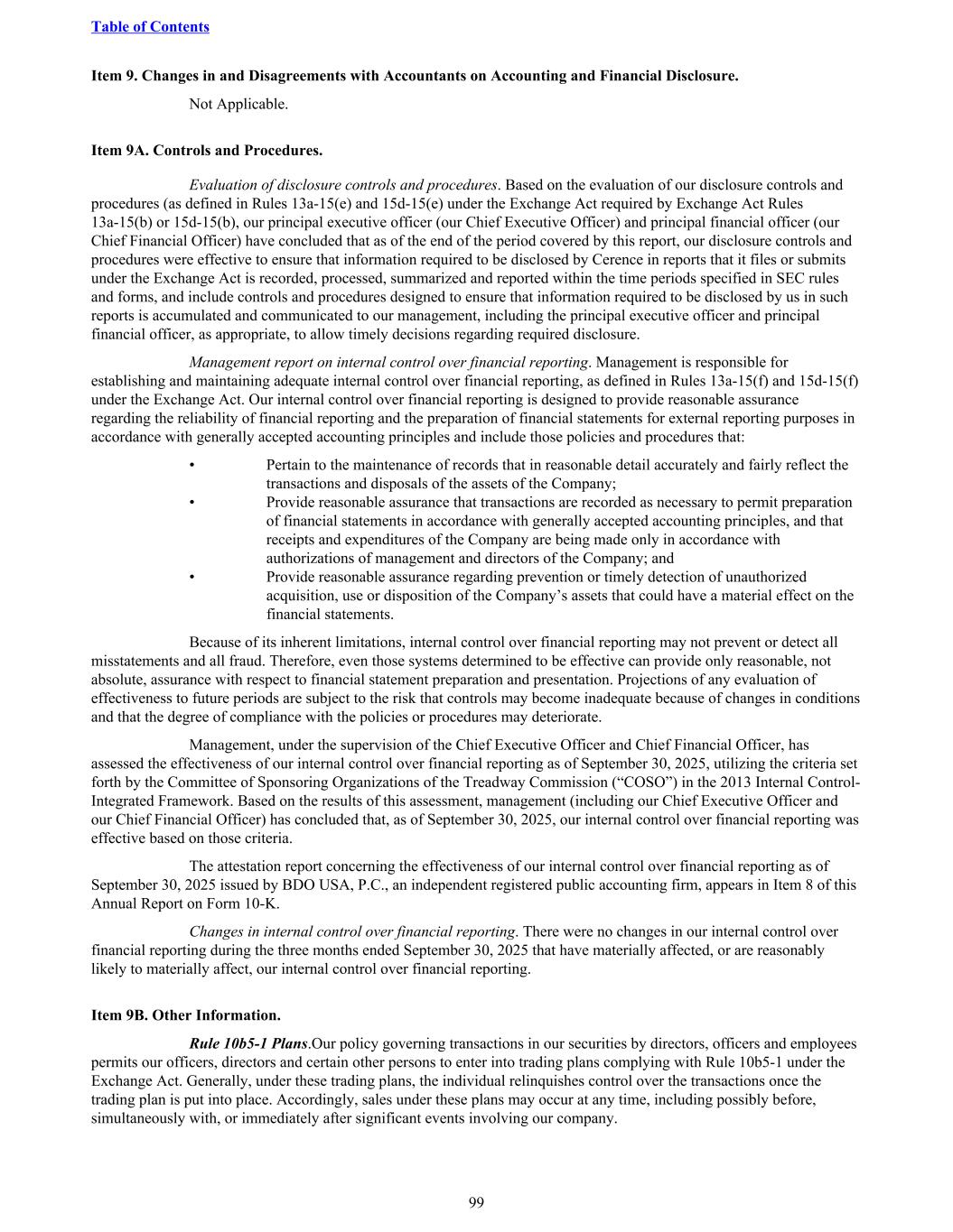 Item 9. Changes in and Disagreements with Accountants on Accounting and Financial Disclosure. Not Applicable. Item 9A. Controls and Procedures. Evaluation of disclosure controls and procedures. Based on the evaluation of our disclosure controls and procedures (as defined in Rules 13a-15(e) and 15d-15(e) under the Exchange Act required by Exchange Act Rules 13a-15(b) or 15d-15(b), our principal executive officer (our Chief Executive Officer) and principal financial officer (our Chief Financial Officer) have concluded that as of the end of the period covered by this report, our disclosure controls and procedures were effective to ensure that information required to be disclosed by Cerence in reports that it files or submits under the Exchange Act is recorded, processed, summarized and reported within the time periods specified in SEC rules and forms, and include controls and procedures designed to ensure that information required to be disclosed by us in such reports is accumulated and communicated to our management, including the principal executive officer and principal financial officer, as appropriate, to allow timely decisions regarding required disclosure. Management report on internal control over financial reporting. Management is responsible for establishing and maintaining adequate internal control over financial reporting, as defined in Rules 13a-15(f) and 15d-15(f) under the Exchange Act. Our internal control over financial reporting is designed to provide reasonable assurance regarding the reliability of financial reporting and the preparation of financial statements for external reporting purposes in accordance with generally accepted accounting principles and include those policies and procedures that: • Pertain to the maintenance of records that in reasonable detail accurately and fairly reflect the transactions and disposals of the assets of the Company; • Provide reasonable assurance that transactions are recorded as necessary to permit preparation of financial statements in accordance with generally accepted accounting principles, and that receipts and expenditures of the Company are being made only in accordance with authorizations of management and directors of the Company; and • Provide reasonable assurance regarding prevention or timely detection of unauthorized acquisition, use or disposition of the Company’s assets that could have a material effect on the financial statements. Because of its inherent limitations, internal control over financial reporting may not prevent or detect all misstatements and all fraud. Therefore, even those systems determined to be effective can provide only reasonable, not absolute, assurance with respect to financial statement preparation and presentation. Projections of any evaluation of effectiveness to future periods are subject to the risk that controls may become inadequate because of changes in conditions and that the degree of compliance with the policies or procedures may deteriorate. Management, under the supervision of the Chief Executive Officer and Chief Financial Officer, has assessed the effectiveness of our internal control over financial reporting as of September 30, 2025, utilizing the criteria set forth by the Committee of Sponsoring Organizations of the Treadway Commission (“COSO”) in the 2013 Internal Control- Integrated Framework. Based on the results of this assessment, management (including our Chief Executive Officer and our Chief Financial Officer) has concluded that, as of September 30, 2025, our internal control over financial reporting was effective based on those criteria. The attestation report concerning the effectiveness of our internal control over financial reporting as of September 30, 2025 issued by BDO USA, P.C., an independent registered public accounting firm, appears in Item 8 of this Annual Report on Form 10-K. Changes in internal control over financial reporting. There were no changes in our internal control over financial reporting during the three months ended September 30, 2025 that have materially affected, or are reasonably likely to materially affect, our internal control over financial reporting. Item 9B. Other Information. Rule 10b5-1 Plans.Our policy governing transactions in our securities by directors, officers and employees permits our officers, directors and certain other persons to enter into trading plans complying with Rule 10b5-1 under the Exchange Act. Generally, under these trading plans, the individual relinquishes control over the transactions once the trading plan is put into place. Accordingly, sales under these plans may occur at any time, including possibly before, simultaneously with, or immediately after significant events involving our company. Table of Contents 99