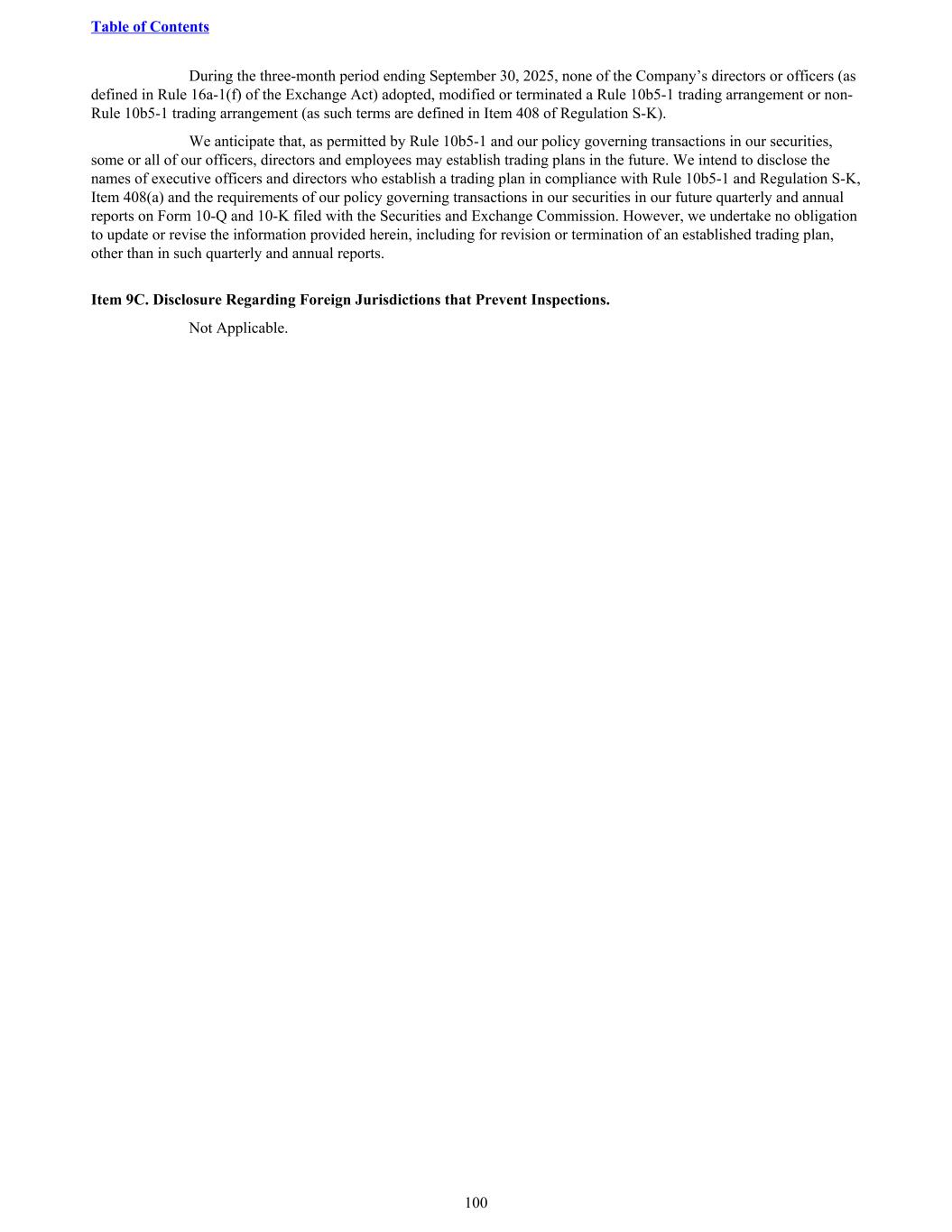 During the three-month period ending September 30, 2025, none of the Company’s directors or officers (as defined in Rule 16a-1(f) of the Exchange Act) adopted, modified or terminated a Rule 10b5-1 trading arrangement or non- Rule 10b5-1 trading arrangement (as such terms are defined in Item 408 of Regulation S-K). We anticipate that, as permitted by Rule 10b5-1 and our policy governing transactions in our securities, some or all of our officers, directors and employees may establish trading plans in the future. We intend to disclose the names of executive officers and directors who establish a trading plan in compliance with Rule 10b5-1 and Regulation S-K, Item 408(a) and the requirements of our policy governing transactions in our securities in our future quarterly and annual reports on Form 10-Q and 10-K filed with the Securities and Exchange Commission. However, we undertake no obligation to update or revise the information provided herein, including for revision or termination of an established trading plan, other than in such quarterly and annual reports. Item 9C. Disclosure Regarding Foreign Jurisdictions that Prevent Inspections. Not Applicable. Table of Contents 100