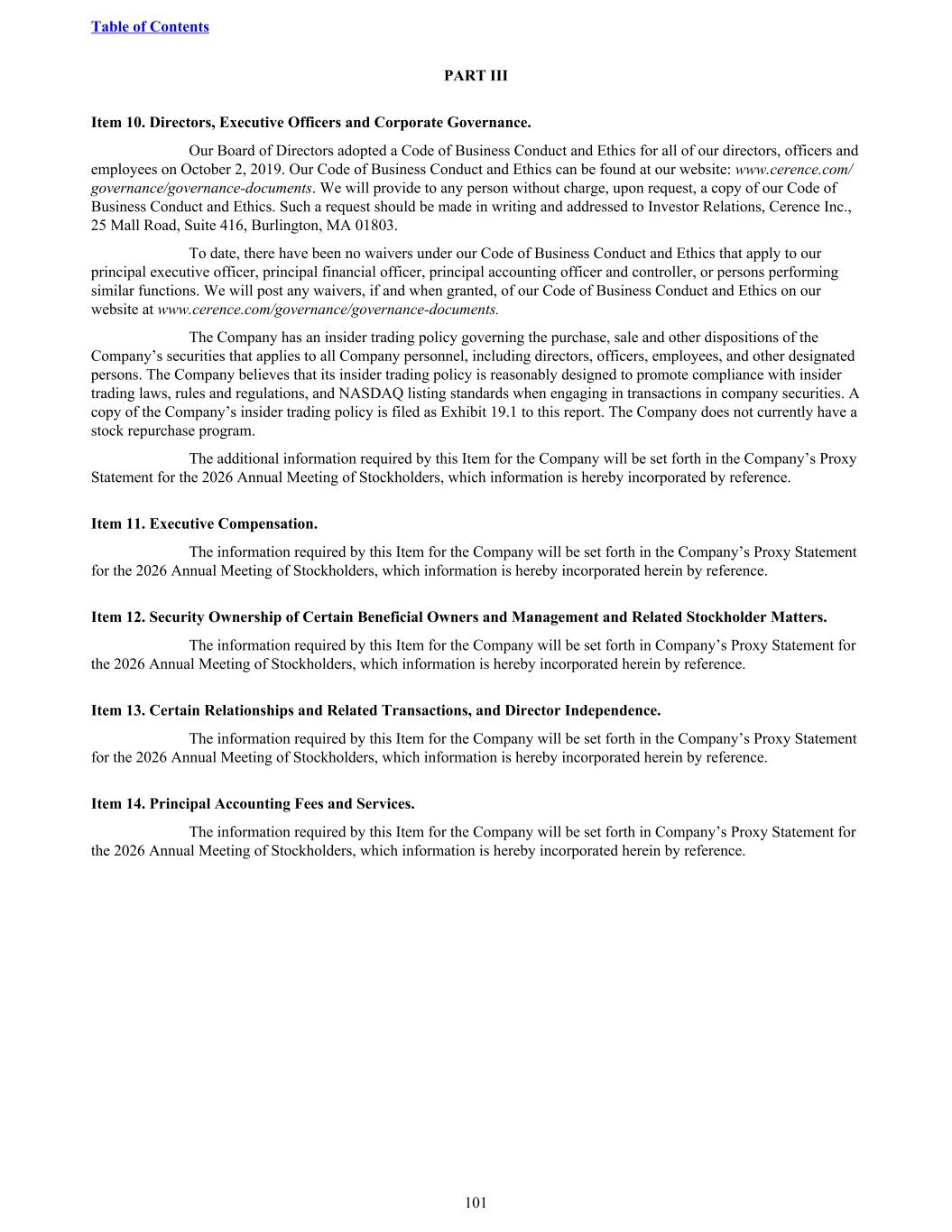 PART III Item 10. Directors, Executive Officers and Corporate Governance. Our Board of Directors adopted a Code of Business Conduct and Ethics for all of our directors, officers and employees on October 2, 2019. Our Code of Business Conduct and Ethics can be found at our website: www.cerence.com/ governance/governance-documents. We will provide to any person without charge, upon request, a copy of our Code of Business Conduct and Ethics. Such a request should be made in writing and addressed to Investor Relations, Cerence Inc., 25 Mall Road, Suite 416, Burlington, MA 01803. To date, there have been no waivers under our Code of Business Conduct and Ethics that apply to our principal executive officer, principal financial officer, principal accounting officer and controller, or persons performing similar functions. We will post any waivers, if and when granted, of our Code of Business Conduct and Ethics on our website at www.cerence.com/governance/governance-documents. The Company has an insider trading policy governing the purchase, sale and other dispositions of the Company’s securities that applies to all Company personnel, including directors, officers, employees, and other designated persons. The Company believes that its insider trading policy is reasonably designed to promote compliance with insider trading laws, rules and regulations, and NASDAQ listing standards when engaging in transactions in company securities. A copy of the Company’s insider trading policy is filed as Exhibit 19.1 to this report. The Company does not currently have a stock repurchase program. The additional information required by this Item for the Company will be set forth in the Company’s Proxy Statement for the 2026 Annual Meeting of Stockholders, which information is hereby incorporated by reference. Item 11. Executive Compensation. The information required by this Item for the Company will be set forth in the Company’s Proxy Statement for the 2026 Annual Meeting of Stockholders, which information is hereby incorporated herein by reference. Item 12. Security Ownership of Certain Beneficial Owners and Management and Related Stockholder Matters. The information required by this Item for the Company will be set forth in Company’s Proxy Statement for the 2026 Annual Meeting of Stockholders, which information is hereby incorporated herein by reference. Item 13. Certain Relationships and Related Transactions, and Director Independence. The information required by this Item for the Company will be set forth in the Company’s Proxy Statement for the 2026 Annual Meeting of Stockholders, which information is hereby incorporated herein by reference. Item 14. Principal Accounting Fees and Services. The information required by this Item for the Company will be set forth in Company’s Proxy Statement for the 2026 Annual Meeting of Stockholders, which information is hereby incorporated herein by reference. Table of Contents 101