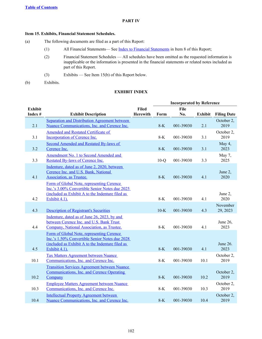PART IV Item 15. Exhibits, Financial Statement Schedules. (a) The following documents are filed as a part of this Report: (1) All Financial Statements— See Index to Financial Statements in Item 8 of this Report; (2) Financial Statement Schedules — All schedules have been omitted as the requested information is inapplicable or the information is presented in the financial statements or related notes included as part of this Report. (3) Exhibits — See Item 15(b) of this Report below. (b) Exhibits. EXHIBIT INDEX Incorporated by Reference Exhibit Index # Exhibit Description Filed Herewith Form File No. Exhibit Filing Date 2.1 Separation and Distribution Agreement between Nuance Communications, Inc. and Cerence Inc. 8-K 001-39030 2.1 October 2, 2019 3.1 Amended and Restated Certificate of Incorporation of Cerence Inc. 8-K 001-39030 3.1 October 2, 2019 3.2 Second Amended and Restated By-laws of Cerence Inc. 8-K 001-39030 3.1 May 4, 2023 3.3 Amendment No. 1 to Second Amended and Restated By-laws of Cerence Inc. 10-Q 001-39030 3.3 May 7, 2025 4.1 Indenture, dated as of June 2, 2020, between Cerence Inc. and U.S. Bank, National Association, as Trustee. 8-K 001-39030 4.1 June 2, 2020 4.2 Form of Global Note, representing Cerence Inc.’s 3.00% Convertible Senior Notes due 2025 (included as Exhibit A to the Indenture filed as Exhibit 4.1). 8-K 001-39030 4.1 June 2, 2020 4.3 Description of Registrant's Securities 10-K 001-39030 4.3 November 29, 2023 4.4 Indenture, dated as of June 26, 2023, by and between Cerence Inc. and U.S. Bank Trust Company, National Association, as Trustee. 8-K 001-39030 4.1 June 26, 2023 4.5 Form of Global Note, representing Cerence Inc.’s 1.50% Convertible Senior Notes due 2028 (included as Exhibit A to the Indenture filed as Exhibit 4.1). 8-K 001-39030 4.1 June 26. 2023 10.1 Tax Matters Agreement between Nuance Communications, Inc. and Cerence Inc. 8-K 001-39030 10.1 October 2, 2019 10.2 Transition Services Agreement between Nuance Communications, Inc. and Cerence Operating Company 8-K 001-39030 10.2 October 2, 2019 10.3 Employee Matters Agreement between Nuance Communications, Inc. and Cerence Inc. 8-K 001-39030 10.3 October 2, 2019 10.4 Intellectual Property Agreement between Nuance Communications, Inc. and Cerence Inc. 8-K 001-39030 10.4 October 2, 2019 Table of Contents 102