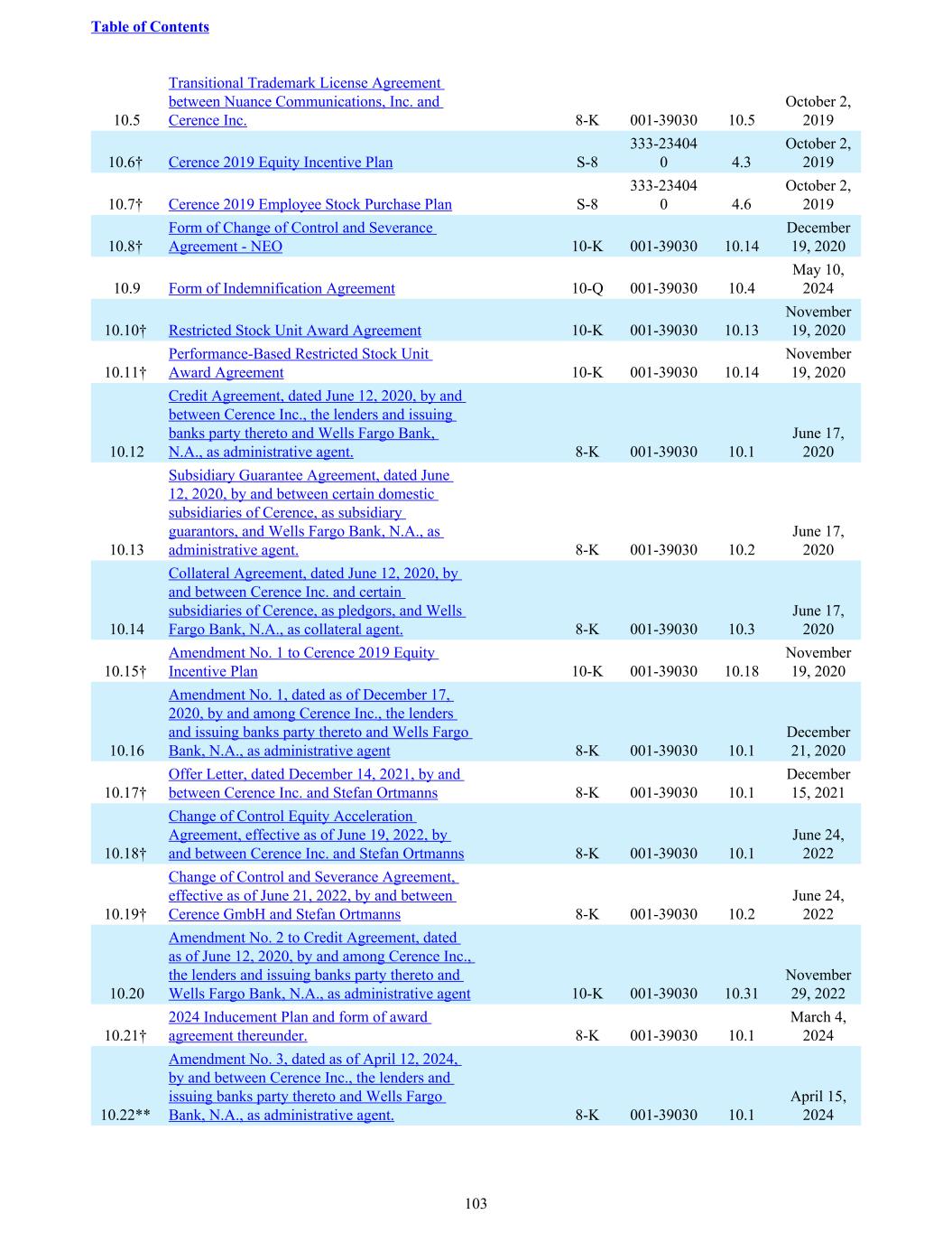 10.5 Transitional Trademark License Agreement between Nuance Communications, Inc. and Cerence Inc. 8-K 001-39030 10.5 October 2, 2019 10.6† Cerence 2019 Equity Incentive Plan S-8 333-23404 0 4.3 October 2, 2019 10.7† Cerence 2019 Employee Stock Purchase Plan S-8 333-23404 0 4.6 October 2, 2019 10.8† Form of Change of Control and Severance Agreement - NEO 10-K 001-39030 10.14 December 19, 2020 10.9 Form of Indemnification Agreement 10-Q 001-39030 10.4 May 10, 2024 10.10† Restricted Stock Unit Award Agreement 10-K 001-39030 10.13 November 19, 2020 10.11† Performance-Based Restricted Stock Unit Award Agreement 10-K 001-39030 10.14 November 19, 2020 10.12 Credit Agreement, dated June 12, 2020, by and between Cerence Inc., the lenders and issuing banks party thereto and Wells Fargo Bank, N.A., as administrative agent. 8-K 001-39030 10.1 June 17, 2020 10.13 Subsidiary Guarantee Agreement, dated June 12, 2020, by and between certain domestic subsidiaries of Cerence, as subsidiary guarantors, and Wells Fargo Bank, N.A., as administrative agent. 8-K 001-39030 10.2 June 17, 2020 10.14 Collateral Agreement, dated June 12, 2020, by and between Cerence Inc. and certain subsidiaries of Cerence, as pledgors, and Wells Fargo Bank, N.A., as collateral agent. 8-K 001-39030 10.3 June 17, 2020 10.15† Amendment No. 1 to Cerence 2019 Equity Incentive Plan 10-K 001-39030 10.18 November 19, 2020 10.16 Amendment No. 1, dated as of December 17, 2020, by and among Cerence Inc., the lenders and issuing banks party thereto and Wells Fargo Bank, N.A., as administrative agent 8-K 001-39030 10.1 December 21, 2020 10.17† Offer Letter, dated December 14, 2021, by and between Cerence Inc. and Stefan Ortmanns 8-K 001-39030 10.1 December 15, 2021 10.18† Change of Control Equity Acceleration Agreement, effective as of June 19, 2022, by and between Cerence Inc. and Stefan Ortmanns 8-K 001-39030 10.1 June 24, 2022 10.19† Change of Control and Severance Agreement, effective as of June 21, 2022, by and between Cerence GmbH and Stefan Ortmanns 8-K 001-39030 10.2 June 24, 2022 10.20 Amendment No. 2 to Credit Agreement, dated as of June 12, 2020, by and among Cerence Inc., the lenders and issuing banks party thereto and Wells Fargo Bank, N.A., as administrative agent 10-K 001-39030 10.31 November 29, 2022 10.21† 2024 Inducement Plan and form of award agreement thereunder. 8-K 001-39030 10.1 March 4, 2024 10.22** Amendment No. 3, dated as of April 12, 2024, by and between Cerence Inc., the lenders and issuing banks party thereto and Wells Fargo Bank, N.A., as administrative agent. 8-K 001-39030 10.1 April 15, 2024 Table of Contents 103