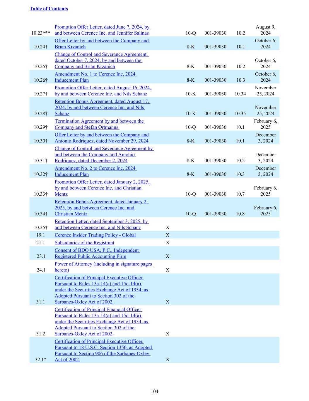 10.23†** Promotion Offer Letter, dated June 7, 2024, by and between Cerence Inc. and Jennifer Salinas 10-Q 001-39030 10.2 August 9, 2024 10.24† Offer Letter by and between the Company and Brian Krzanich 8-K 001-39030 10.1 October 6, 2024 10.25† Change of Control and Severance Agreement, dated October 7, 2024, by and between the Company and Brian Krzanich 8-K 001-39030 10.2 October 6, 2024 10.26† Amendment No. 1 to Cerence Inc. 2024 Inducement Plan 8-K 001-39030 10.3 October 6, 2024 10.27† Promotion Offer Letter, dated August 16, 2024, by and between Cerence Inc. and Nils Schanz 10-K 001-39030 10.34 November 25, 2024 10.28† Retention Bonus Agreement, dated August 17, 2024, by and between Cerence Inc. and Nils Schanz 10-K 001-39030 10.35 November 25, 2024 10.29† Termination Agreement by and between the Company and Stefan Ortmanns 10-Q 001-39030 10.1 February 6, 2025 10.30† Offer Letter by and between the Company and Antonio Rodriquez, dated November 29, 2024 8-K 001-39030 10.1 December 3, 2024 10.31† Change of Control and Severance Agreement by and between the Company and Antonio Rodriquez, dated December 2, 2024 8-K 001-39030 10.2 December 3, 2024 10.32† Amendment No. 2 to Cerence Inc. 2024 Inducement Plan 8-K 001-39030 10.3 December 3, 2024 10.33† Promotion Offer Letter, dated January 2, 2025, by and between Cerence Inc. and Christian Mentz 10-Q 001-39030 10.7 February 6, 2025 10.34† Retention Bonus Agreement, dated January 2, 2025, by and between Cerence Inc. and Christian Mentz 10-Q 001-39030 10.8 February 6, 2025 10.35† Retention Letter, dated September 3, 2025, by and between Cerence Inc. and Nils Schanz X 19.1 Cerence Insider Trading Policy - Global X 21.1 Subsidiaries of the Registrant X 23.1 Consent of BDO USA, P.C., Independent Registered Public Accounting Firm X 24.1 Power of Attorney (including in signature pages hereto) X 31.1 Certification of Principal Executive Officer Pursuant to Rules 13a-14(a) and 15d-14(a) under the Securities Exchange Act of 1934, as Adopted Pursuant to Section 302 of the Sarbanes-Oxley Act of 2002. X 31.2 Certification of Principal Financial Officer Pursuant to Rules 13a-14(a) and 15d-14(a) under the Securities Exchange Act of 1934, as Adopted Pursuant to Section 302 of the Sarbanes-Oxley Act of 2002. X 32.1* Certification of Principal Executive Officer Pursuant to 18 U.S.C. Section 1350, as Adopted Pursuant to Section 906 of the Sarbanes-Oxley Act of 2002. X Table of Contents 104