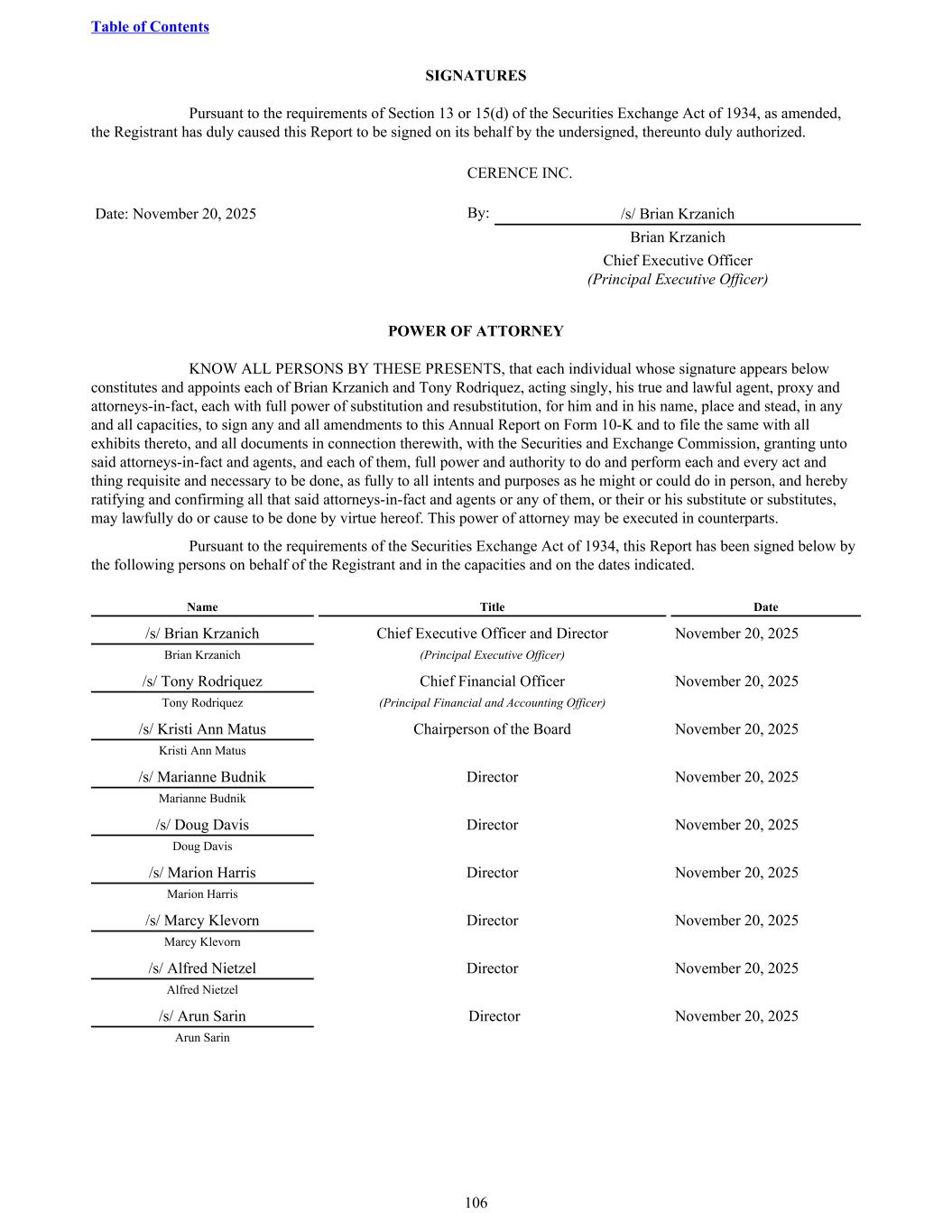 SIGNATURES Pursuant to the requirements of Section 13 or 15(d) of the Securities Exchange Act of 1934, as amended, the Registrant has duly caused this Report to be signed on its behalf by the undersigned, thereunto duly authorized. CERENCE INC. Date: November 20, 2025 By: /s/ Brian Krzanich Brian Krzanich Chief Executive Officer (Principal Executive Officer) POWER OF ATTORNEY KNOW ALL PERSONS BY THESE PRESENTS, that each individual whose signature appears below constitutes and appoints each of Brian Krzanich and Tony Rodriquez, acting singly, his true and lawful agent, proxy and attorneys-in-fact, each with full power of substitution and resubstitution, for him and in his name, place and stead, in any and all capacities, to sign any and all amendments to this Annual Report on Form 10-K and to file the same with all exhibits thereto, and all documents in connection therewith, with the Securities and Exchange Commission, granting unto said attorneys-in-fact and agents, and each of them, full power and authority to do and perform each and every act and thing requisite and necessary to be done, as fully to all intents and purposes as he might or could do in person, and hereby ratifying and confirming all that said attorneys-in-fact and agents or any of them, or their or his substitute or substitutes, may lawfully do or cause to be done by virtue hereof. This power of attorney may be executed in counterparts. Pursuant to the requirements of the Securities Exchange Act of 1934, this Report has been signed below by the following persons on behalf of the Registrant and in the capacities and on the dates indicated. Name Title Date /s/ Brian Krzanich Chief Executive Officer and Director November 20, 2025 Brian Krzanich (Principal Executive Officer) /s/ Tony Rodriquez Chief Financial Officer November 20, 2025 Tony Rodriquez (Principal Financial and Accounting Officer) /s/ Kristi Ann Matus Chairperson of the Board November 20, 2025 Kristi Ann Matus /s/ Marianne Budnik Director November 20, 2025 Marianne Budnik /s/ Doug Davis Director November 20, 2025 Doug Davis /s/ Marion Harris Director November 20, 2025 Marion Harris /s/ Marcy Klevorn Director November 20, 2025 Marcy Klevorn /s/ Alfred Nietzel Director November 20, 2025 Alfred Nietzel /s/ Arun Sarin Director November 20, 2025 Arun Sarin Table of Contents 106